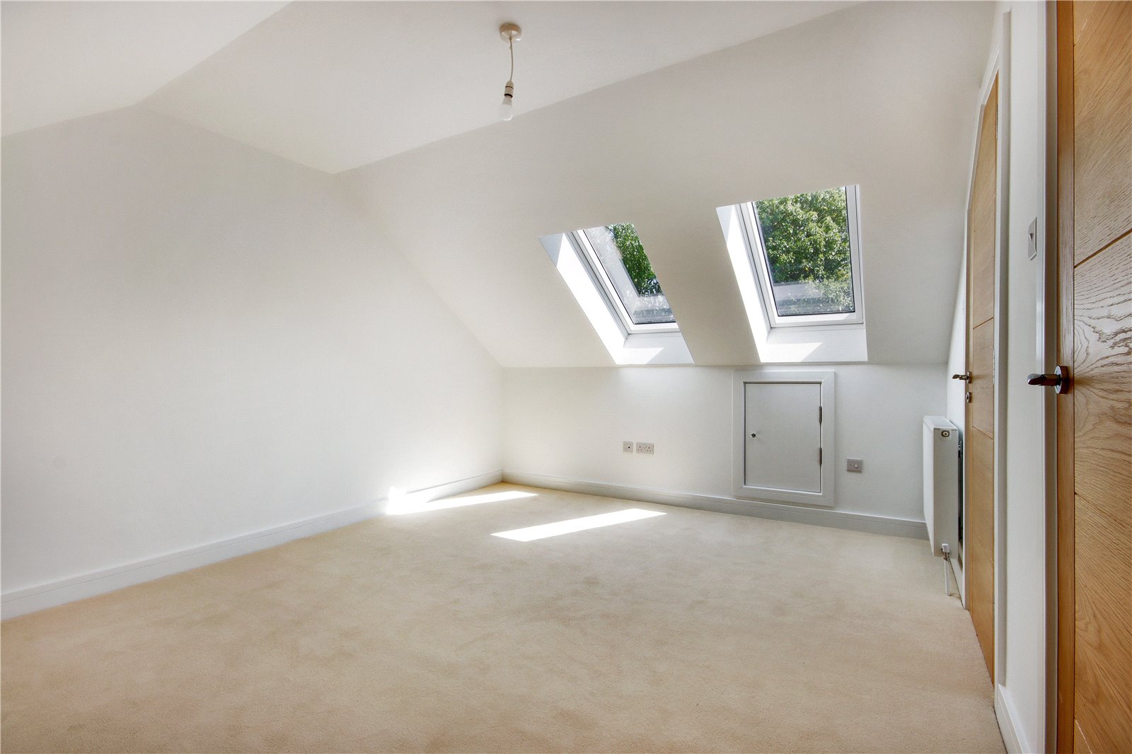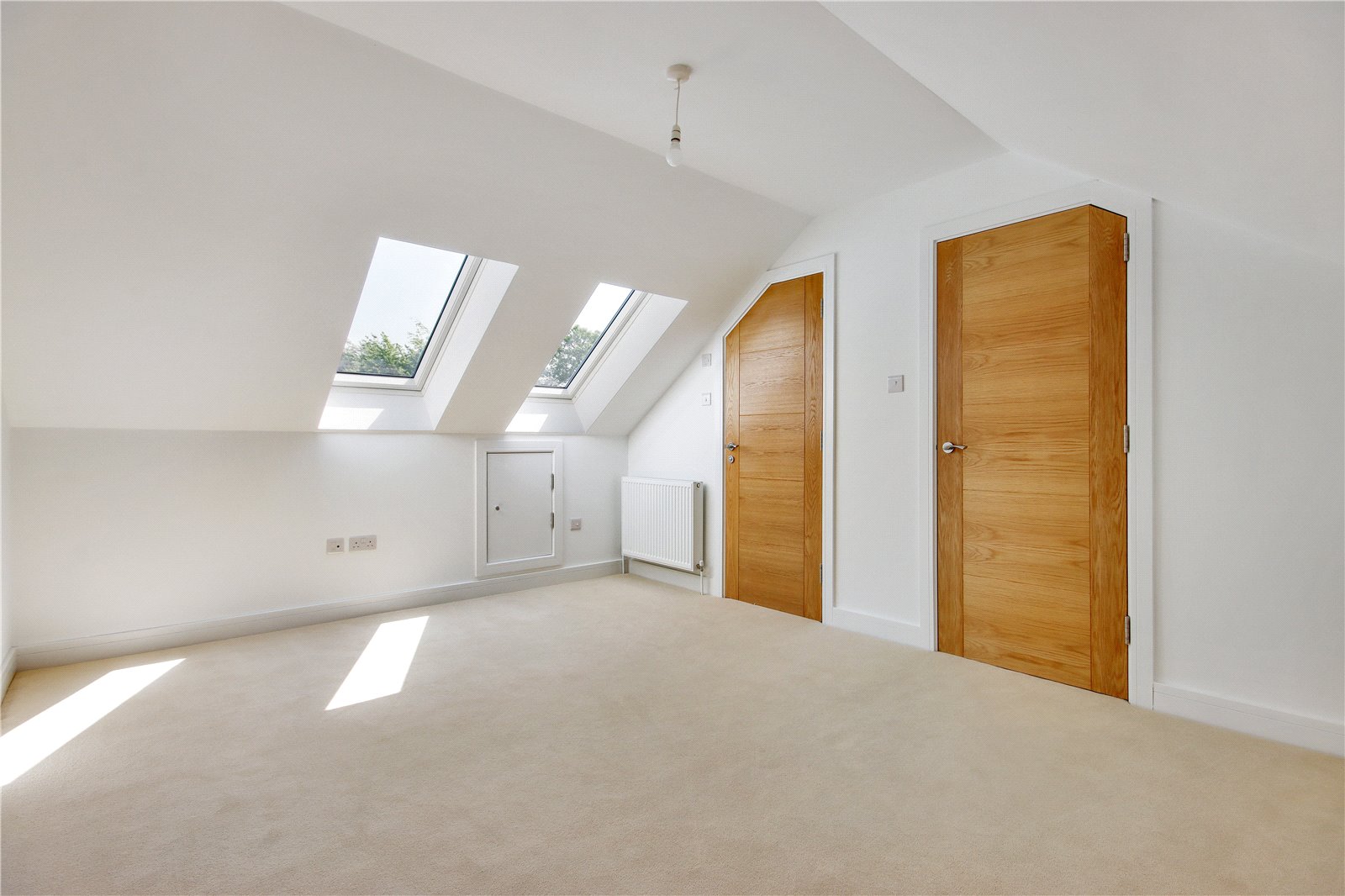 Main Bedroom 14' x 11' (4.27m x 3.35m). Two skylight Velux windows to front. Fitted carpet. Plain ceiling. Radiator. Eaves cupboard.