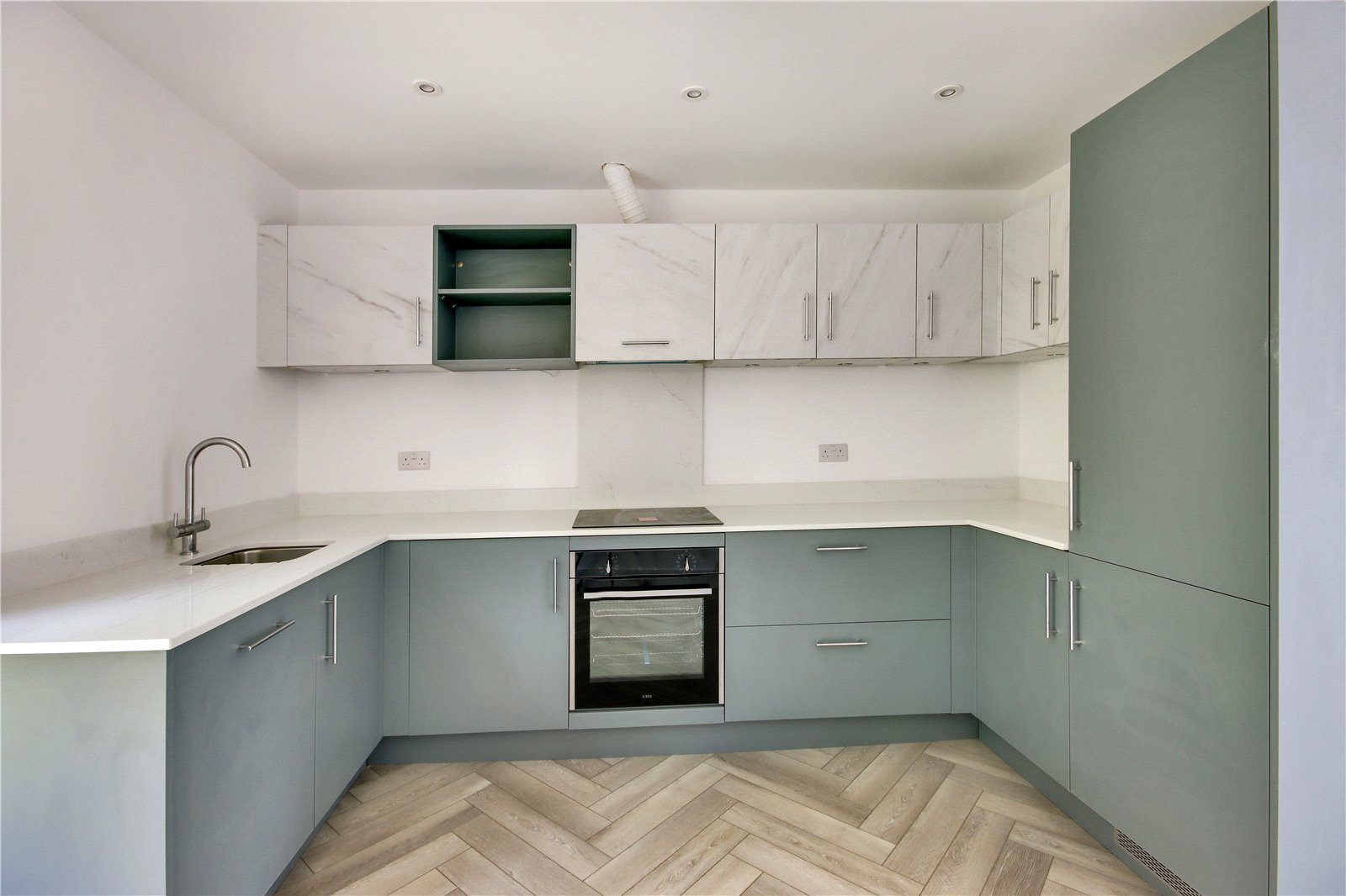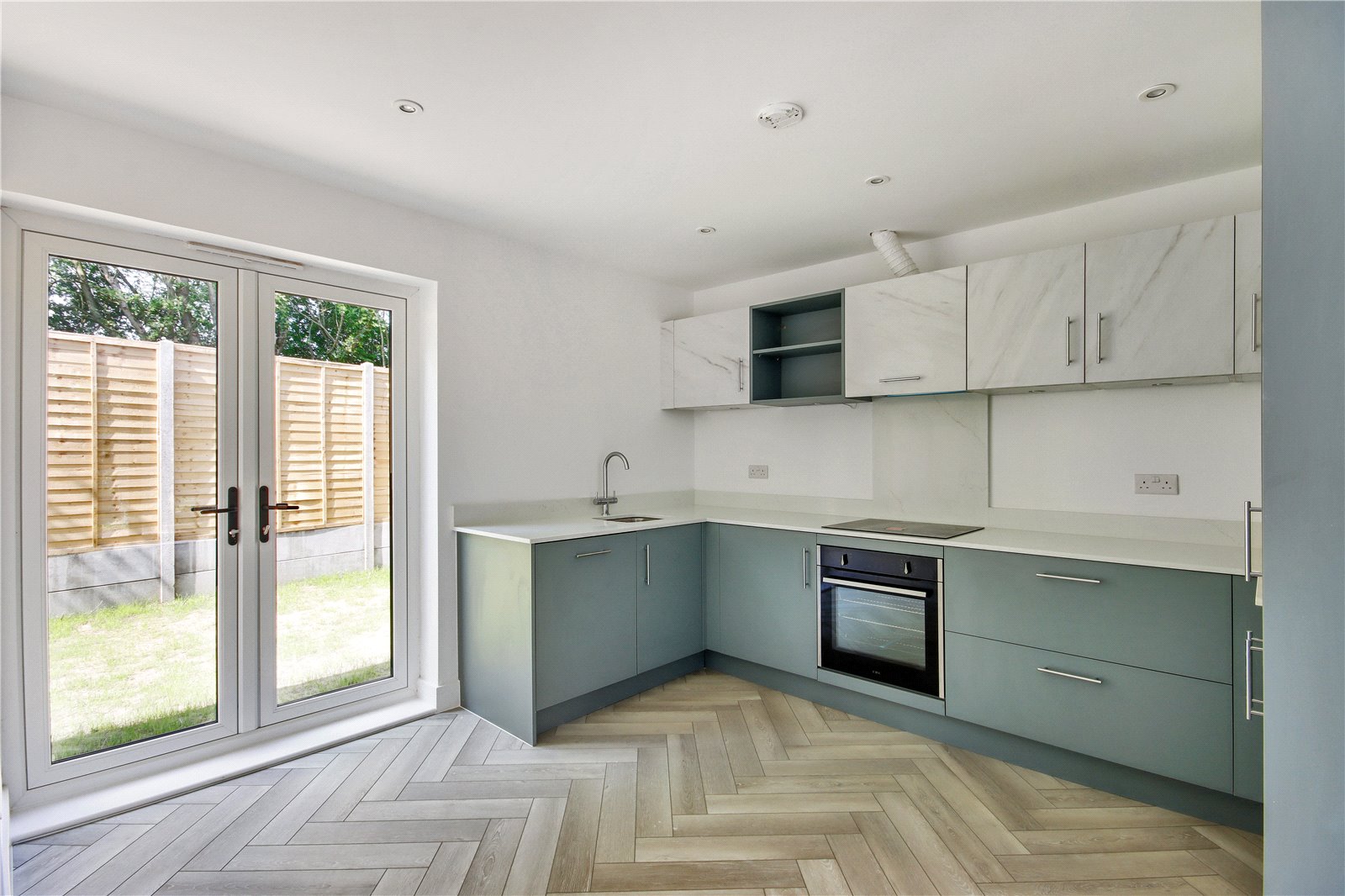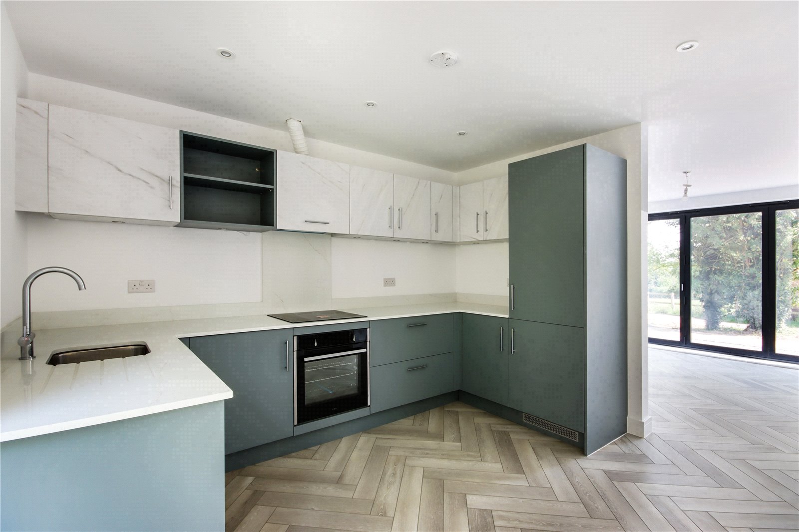 Kitchen 11'6" x 11' (3.5m x 3.35m). Double glazed patio doors to rear. Wood effect flooring with underfloor heating. Plain ceiling. Downlighters. Fitted wall and base units with Quartz worktops over. Stainless steel inset sink and mixer tap. CDA oven and hob. Extractor hood. CDA integrated dishwasher, washing machine and fridge freezer Open plan to living room.