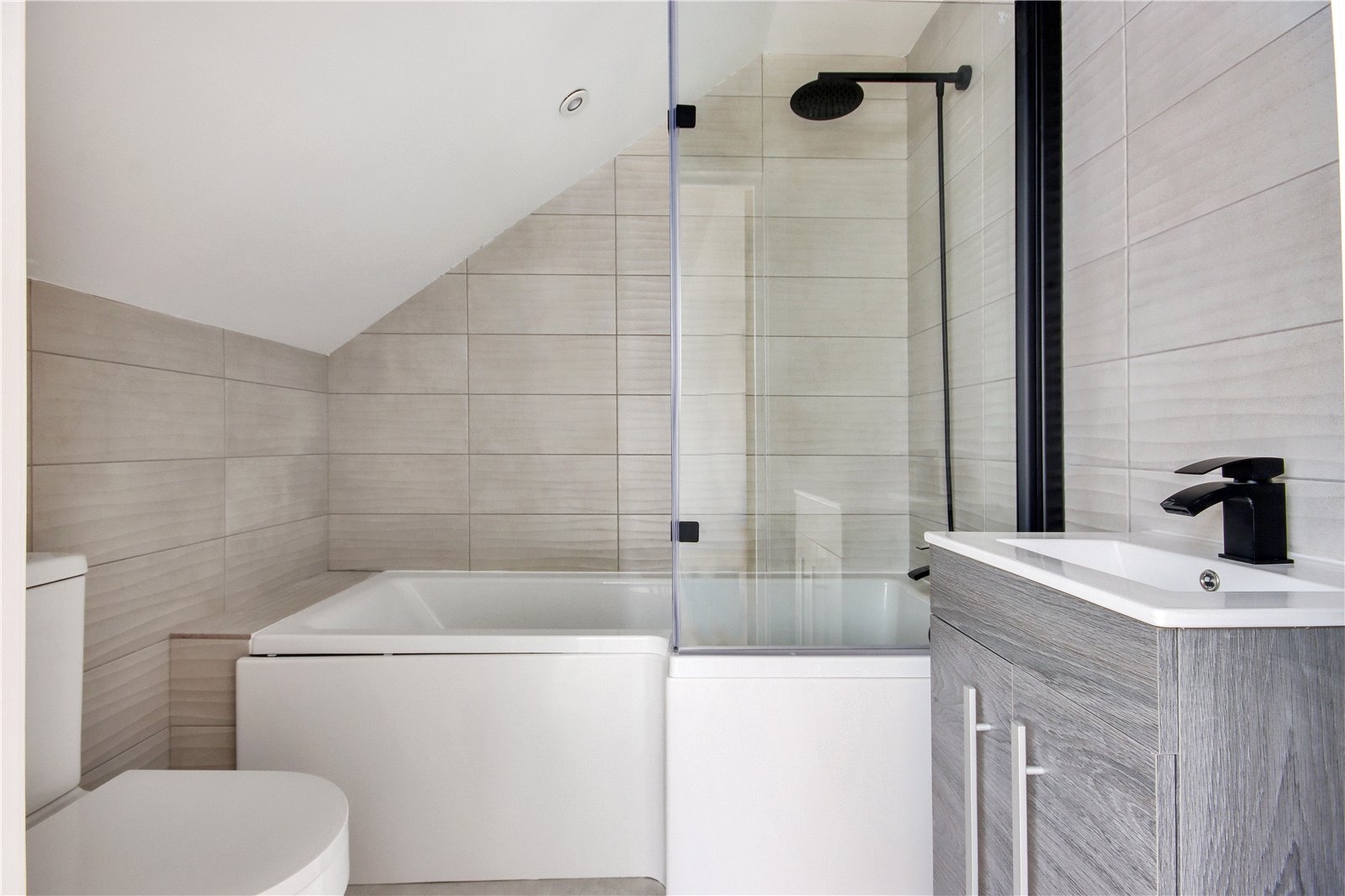 En-Suite Bathroom 6'5" x 5'9" (1.96m x 1.75m). Tiled flooring. Plain ceiling. Downlighters. Heated towel rail. Shower bath with overhead shower and mixer taps and shower screen. Wash hand basin in vanity unit. Low level W.C. Tiled walls. Shaver point.