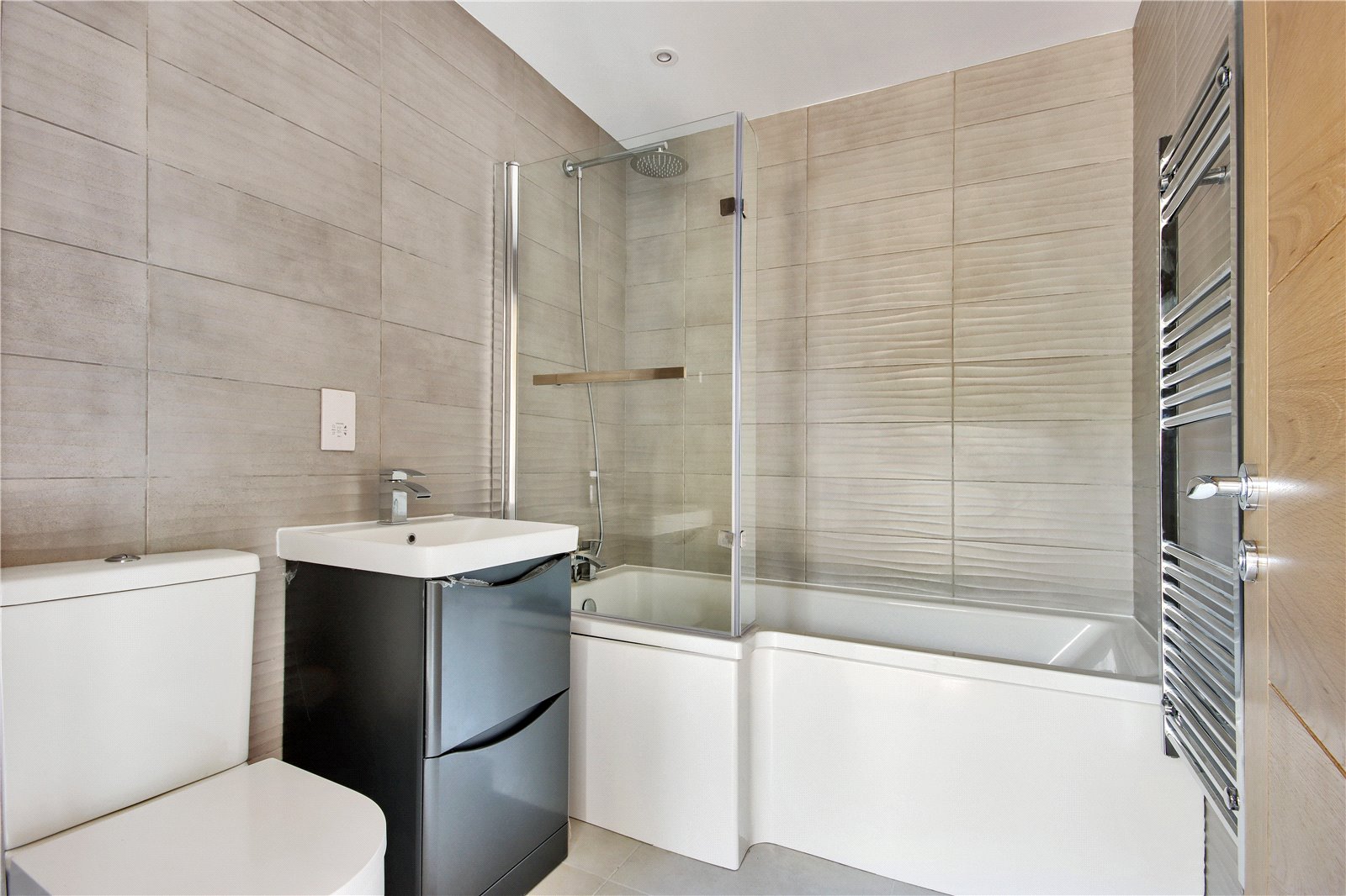 Bathroom 7'2" x 5'10" (2.18m x 1.78m). Tiled flooring with underfloor heating. Plain ceiling. Downlighters. Heated towel rail. Shower bath with overhead shower and mixer tap and shower screen. Shower part tiled. Wash hand basin in vanity unit. Low level W.C. Tiled walls. Shaver point.