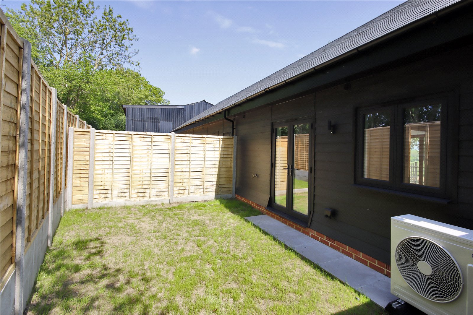 Rear Courtyard Garden 22'2" x 12'9" (6.76m x 3.89m). Paved patio. Lawn. Fenced. Power point. Air source heat pump. Outside light.