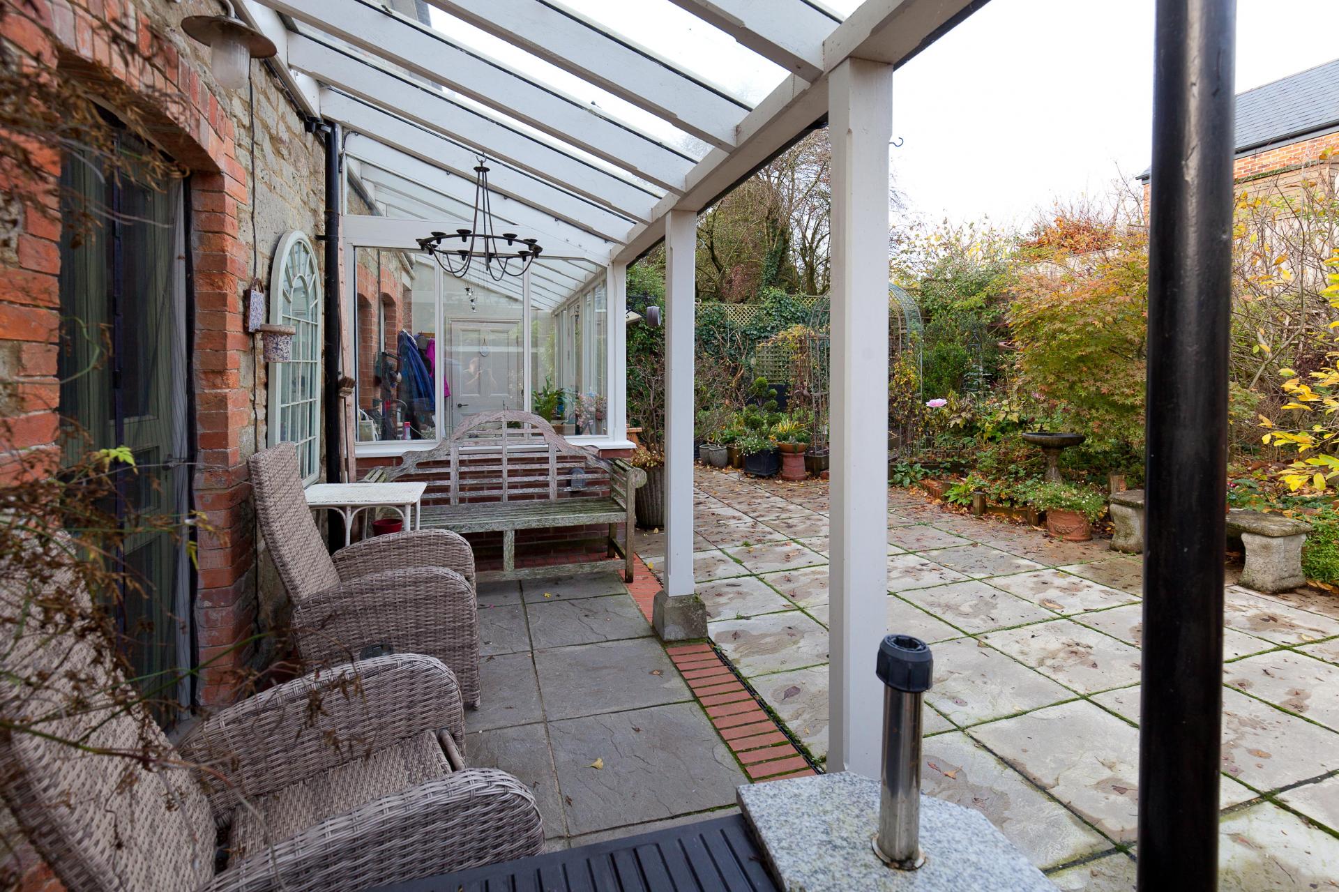 Rear: The rear garden is a delightful space that combines multiple seating and relaxation areas as well as established flower borders, growing planters and hedgerows. Accessed from the dining room is a pleasant pergola adding an inviting extension to the seating areas for the home.