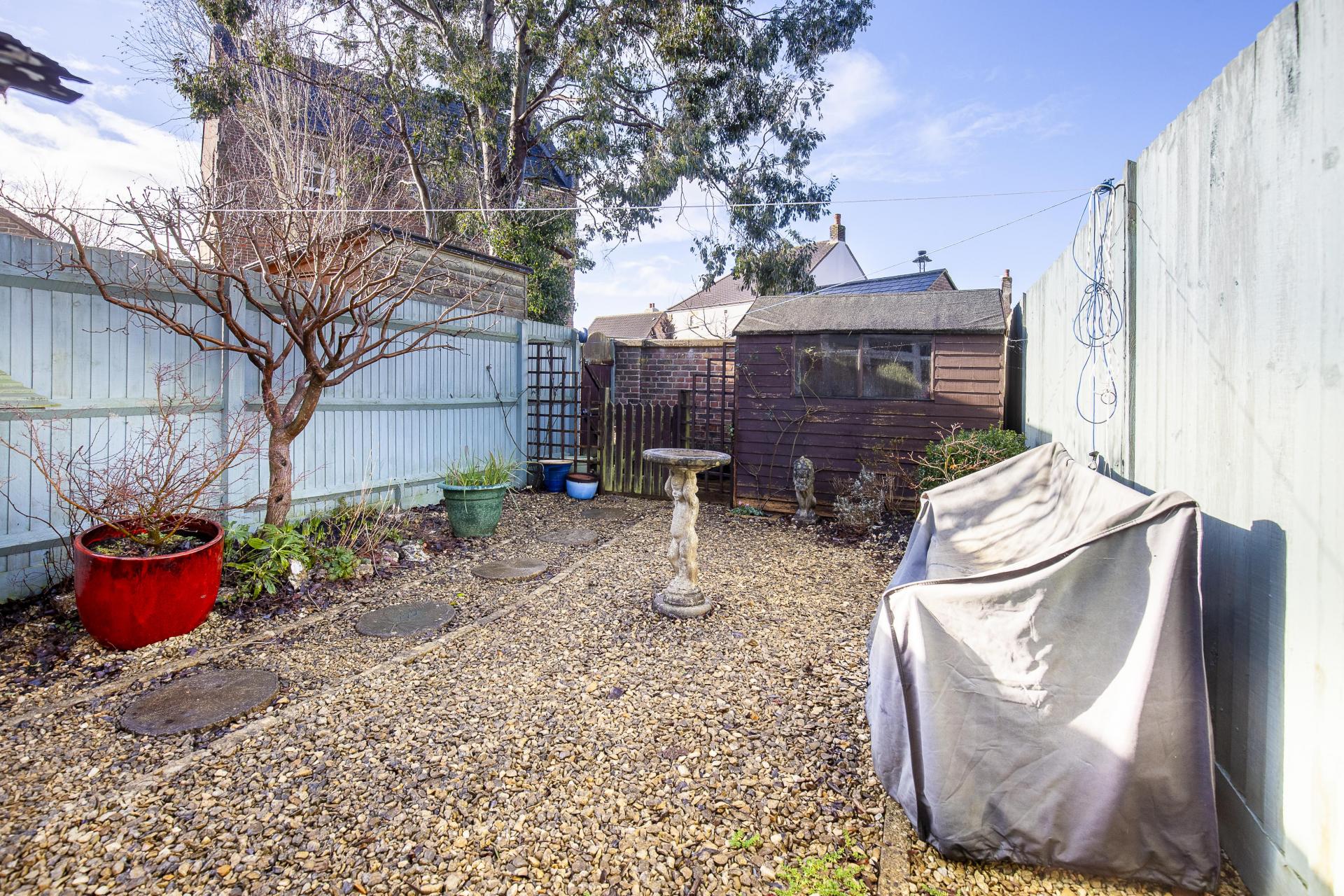 The property enjoys a private and low maintenance rear garden, which is laid to gravel. It benefits from a storage shed as well as a rear access gate leading to the neighbouring road.