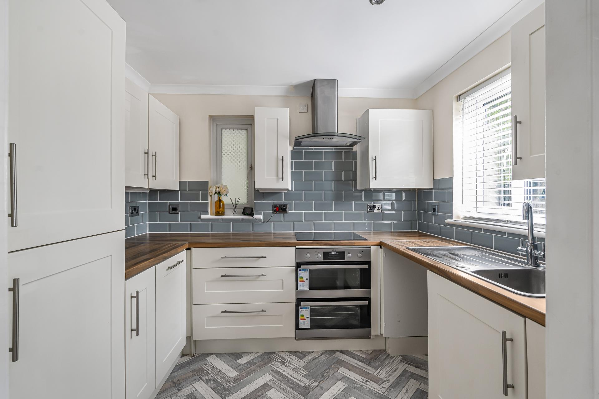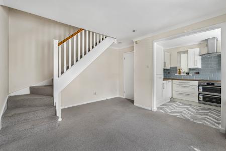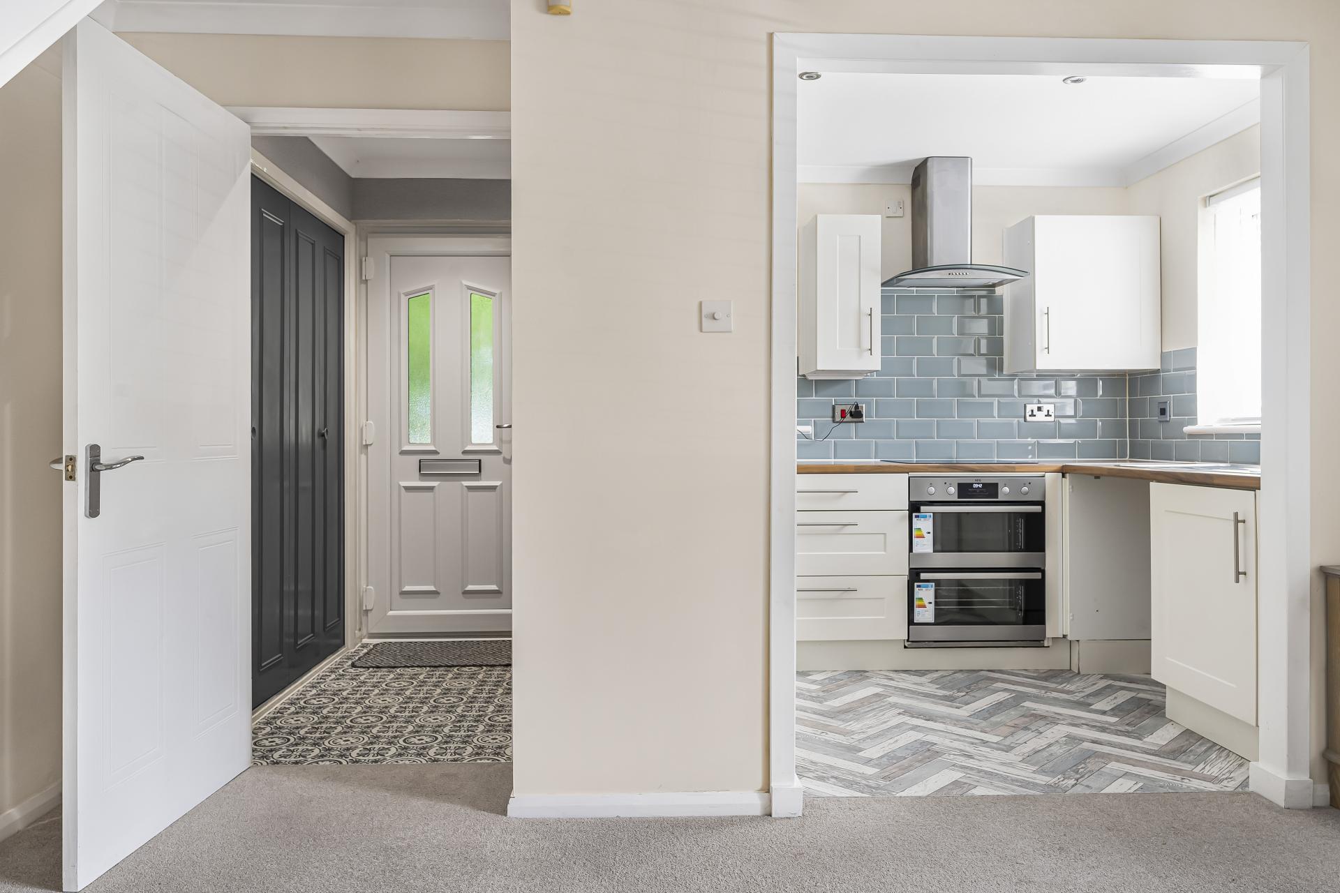 Stepping through the front door, you're welcomed by a handy storage cupboard for coats and shoes. From here, you enter the spacious living room, which wraps around into the modern and stylish kitchen. The kitchen has been recently updated and includes a newly installed AEG oven, built-in fridge freezer, hob, and sleek cabinetry, with fresh flooring that adds to the clean, contemporary feel.