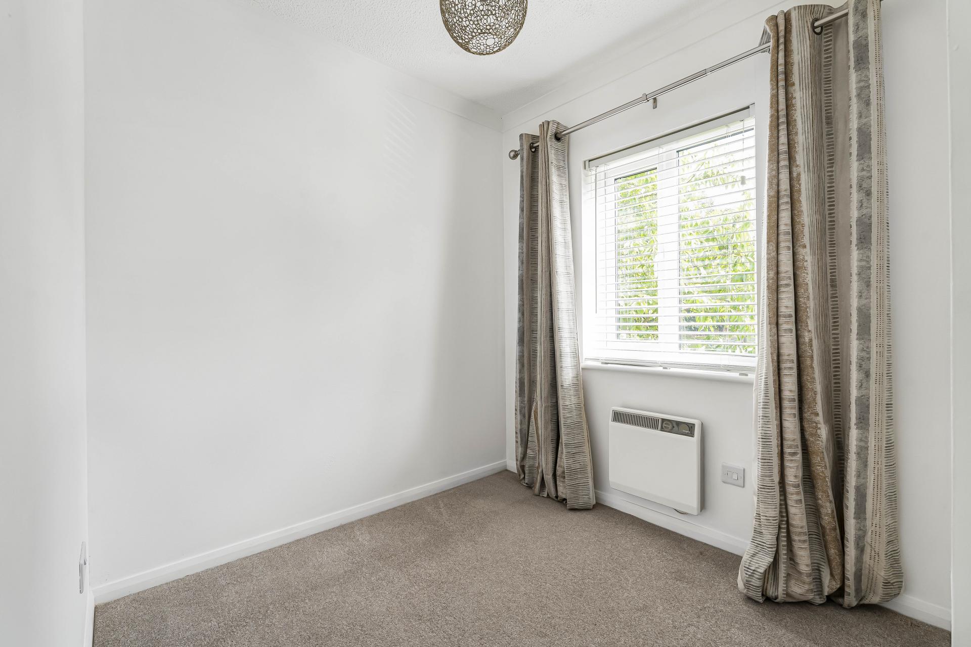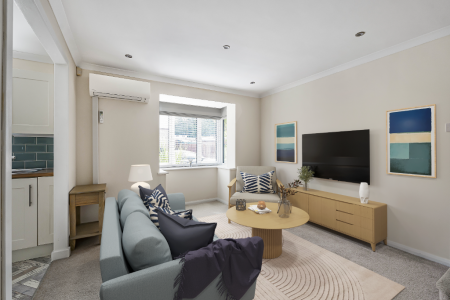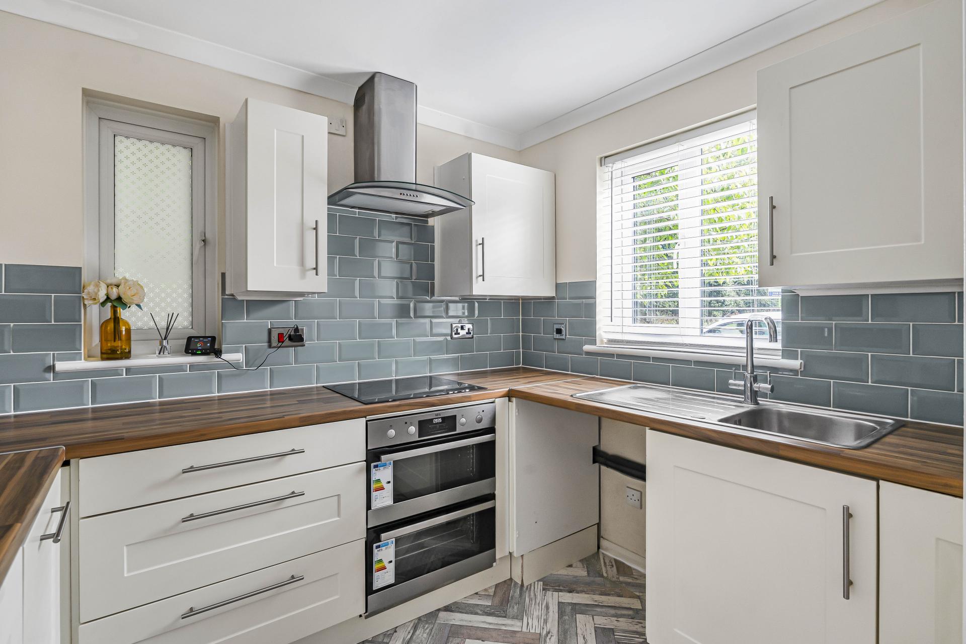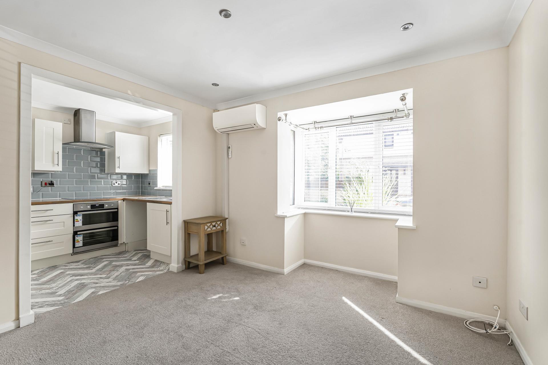Stepping through the front door, you're welcomed by a handy storage cupboard for coats and shoes. From here, you enter the spacious living room, which wraps around into the modern and stylish kitchen. The kitchen has been recently updated and includes a newly installed AEG oven, built-in fridge freezer, hob, and sleek cabinetry, with fresh flooring that adds to the clean, contemporary feel.