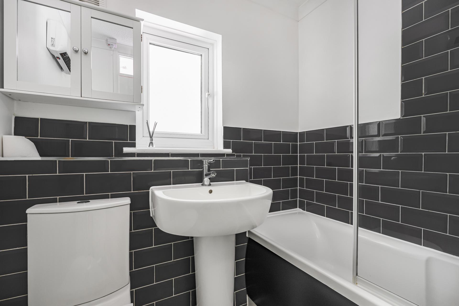 Upstairs, there are two double bedrooms, one of which includes a built-in wardrobe. The stylish bathroom is half-tiled with white walls and features a shower over the bath, a wash basin, and a WC.