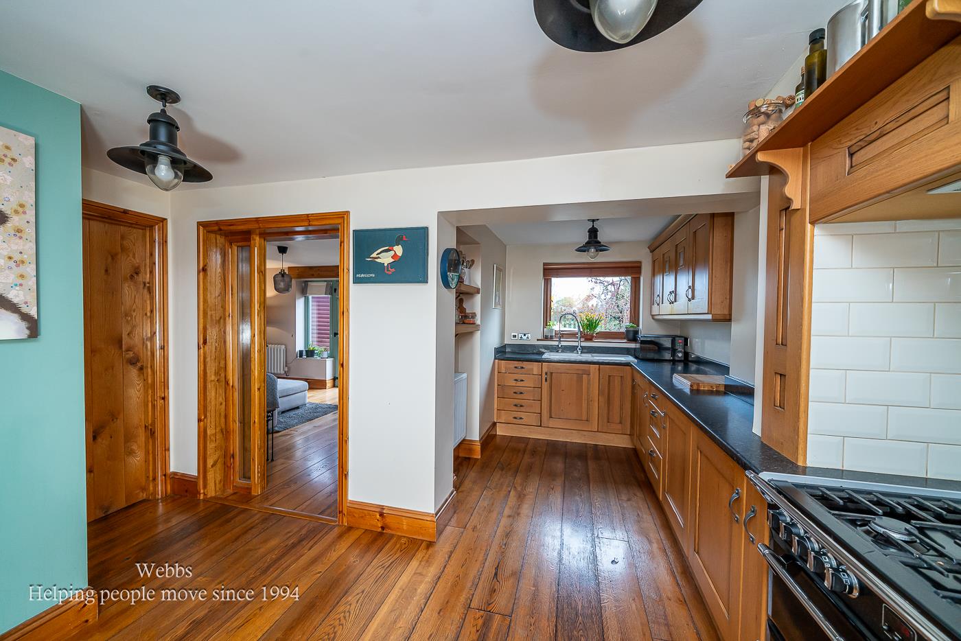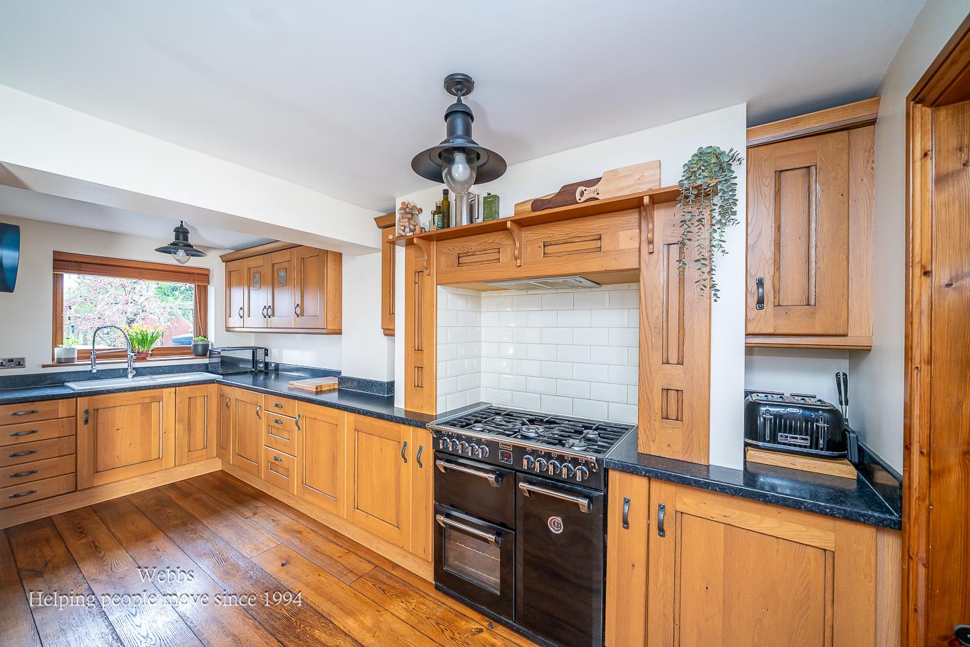 Kitchen - 3.18 x 2.46 m + 2.04 x 2.52 m - The kitchen is fitted with warm wood cabinetry and contrasting dark work surfaces, creating a traditional yet practical space. It features a range cooker with an integrated hood and a farmhouse-style sink positioned beneath a window that looks out onto the garden. The wood-effect flooring complements the cabinetry and the neutral walls, while the layout provides excellent storage and workspace. The kitchen connects to a handy utility/WC, adding to the home's functionality.