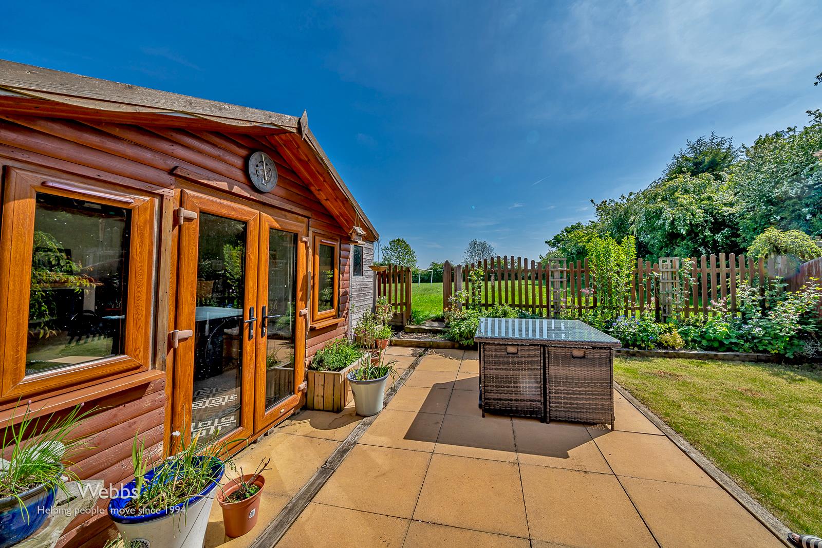 Rear Garden - The rear garden offers a peaceful outdoor space with a paved patio area perfect for dining or relaxing. A well-maintained lawn is bordered by mature shrubs and flowerbeds, creating a pleasant green backdrop. A wooden summerhouse with double doors provides a versatile space for work or leisure, and the garden backs onto an open field, offering lovely views and a sense of privacy.