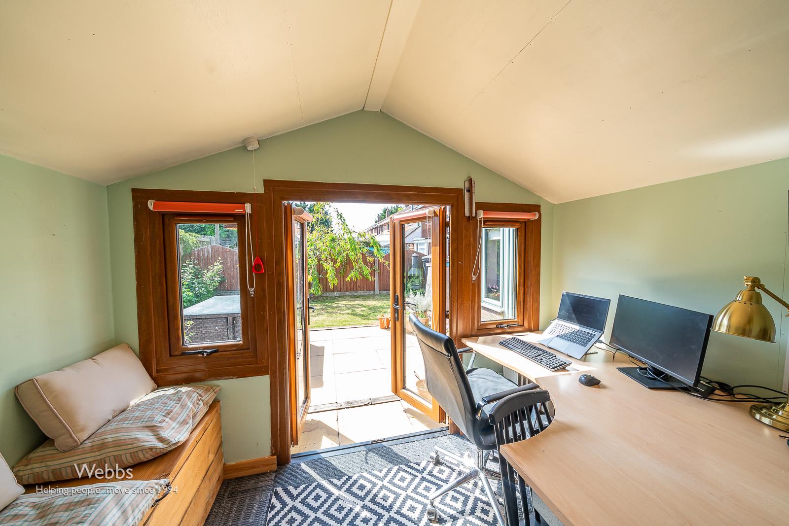 Garden Summerhouse / Office - The home office space in the garden summerhouse benefits from generous natural light through large windows and French doors opening onto the patio. It is painted in a fresh, soft green and fitted with shelves and a large desk, creating an ideal environment for work or creative projects with direct access to the garden.
