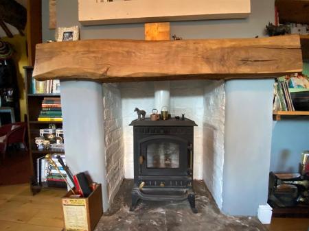With oak flooring and beamed ceiling with a feature fireplace housing a multi fuel burner and having wooden mantel over. uPvc Georgian bar double glazed windows to side and front elevations. double panelled radiator and door through to: