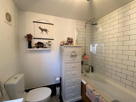 Fitted with a three piece suite comprising panelled bath with shower screen and shower having rainfall and hand held shower head, vanity unit wash hand basin with mixer tap and complimentary tiling with storage drawers below, low level, push button W.C.,With uPvc double glazed, frosted window to the front elevation,, tiled flooring continued through from the kitchen and rear hallway. Chrome, heated towel rail and complimentary tiling.