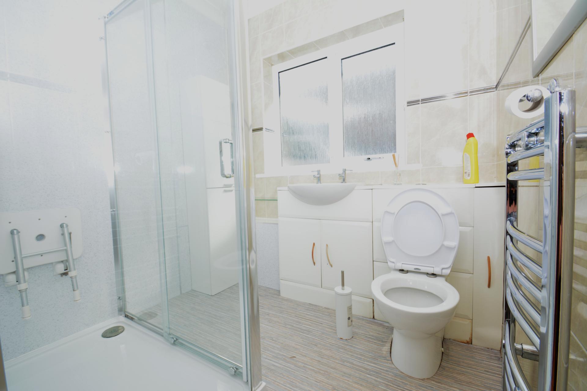 Double shower stall with mains shower, low level WC, vanity wash hand basin, vinyl floor, heated towel rail, double glazed window.