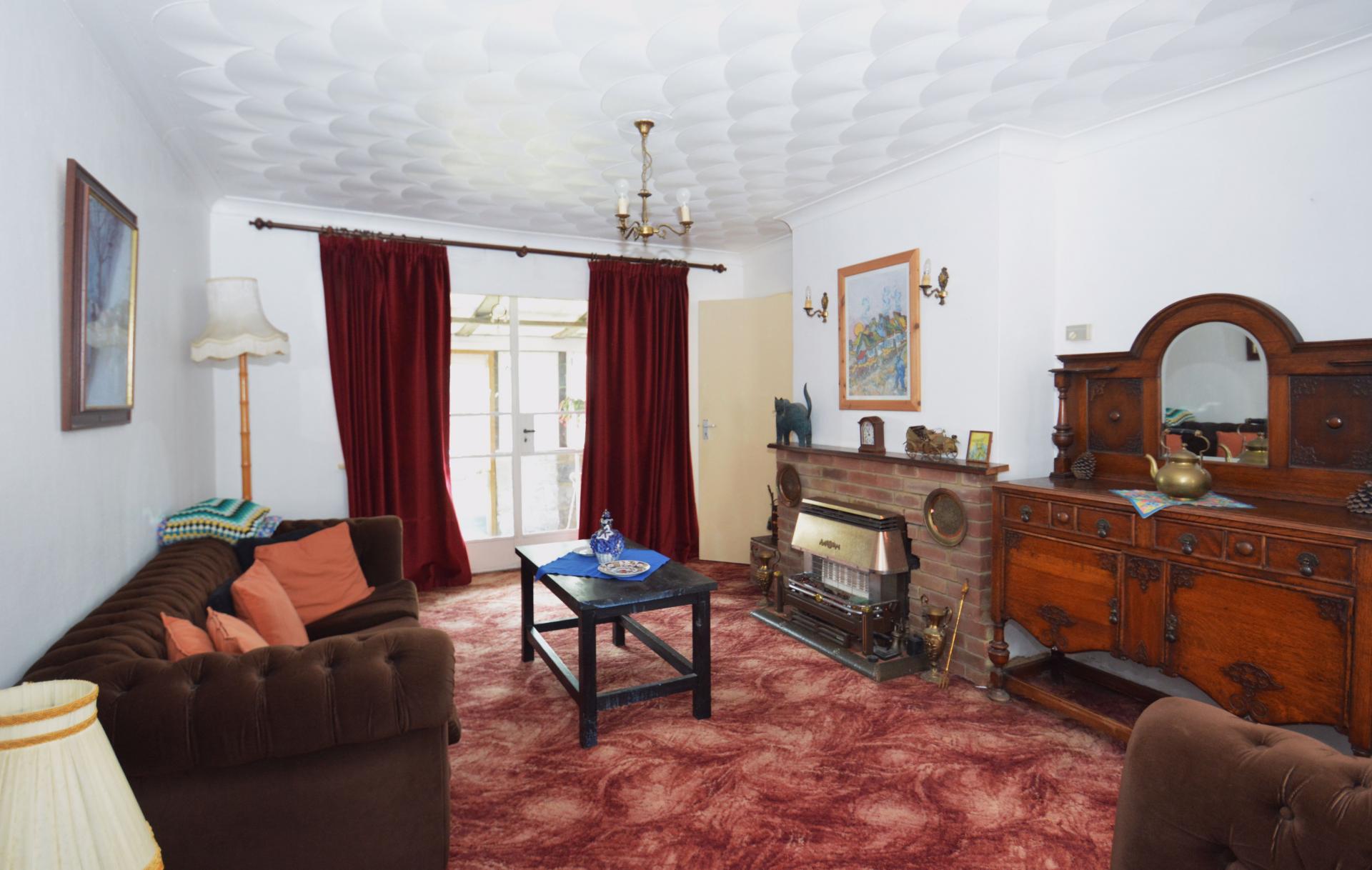 Carpeted floor, radiator panel, x1, gas fire as fitted, coved ceiling.