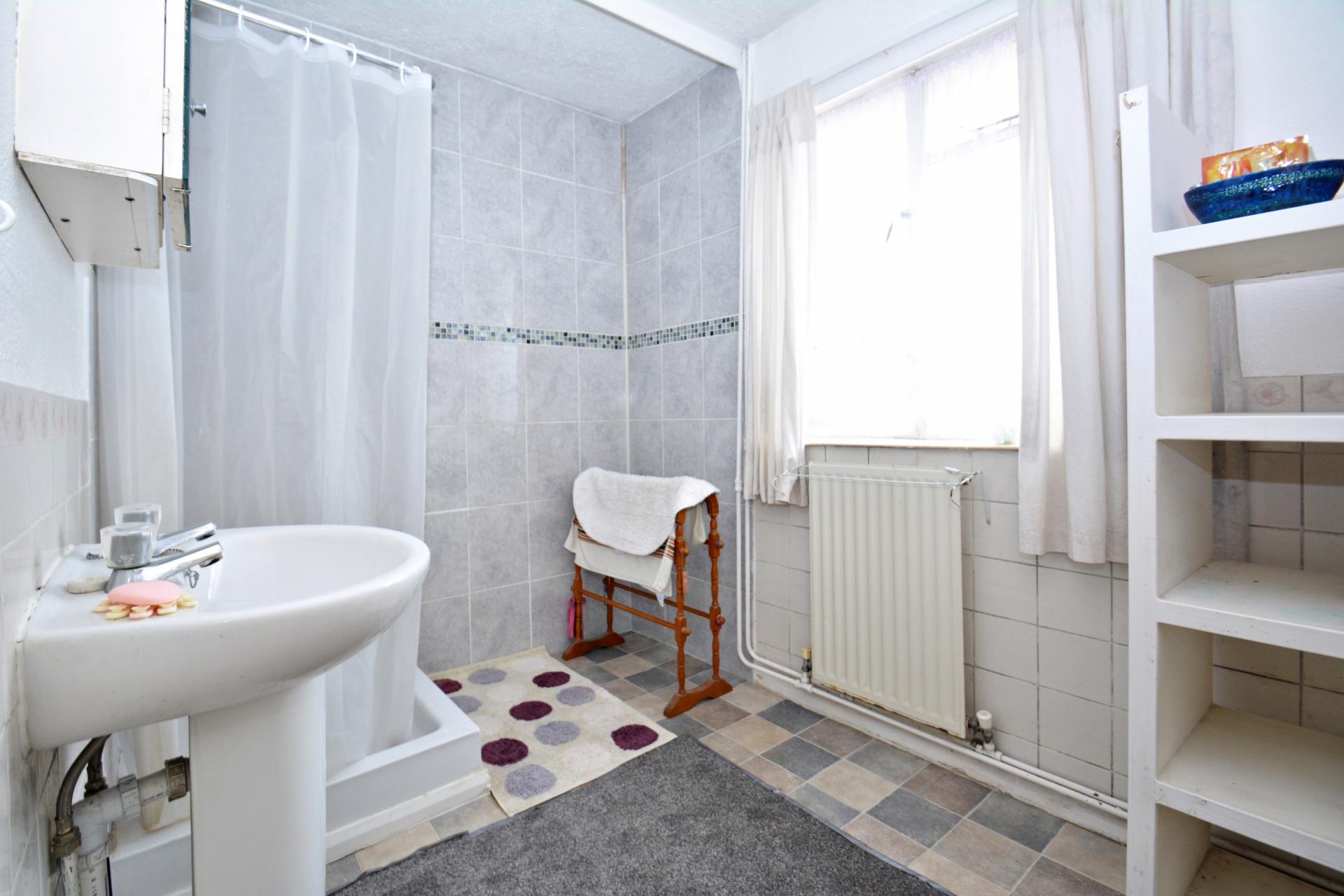 Vinyl floor, tiled shower stall with electric shower, radiator panel, wash hand basin.