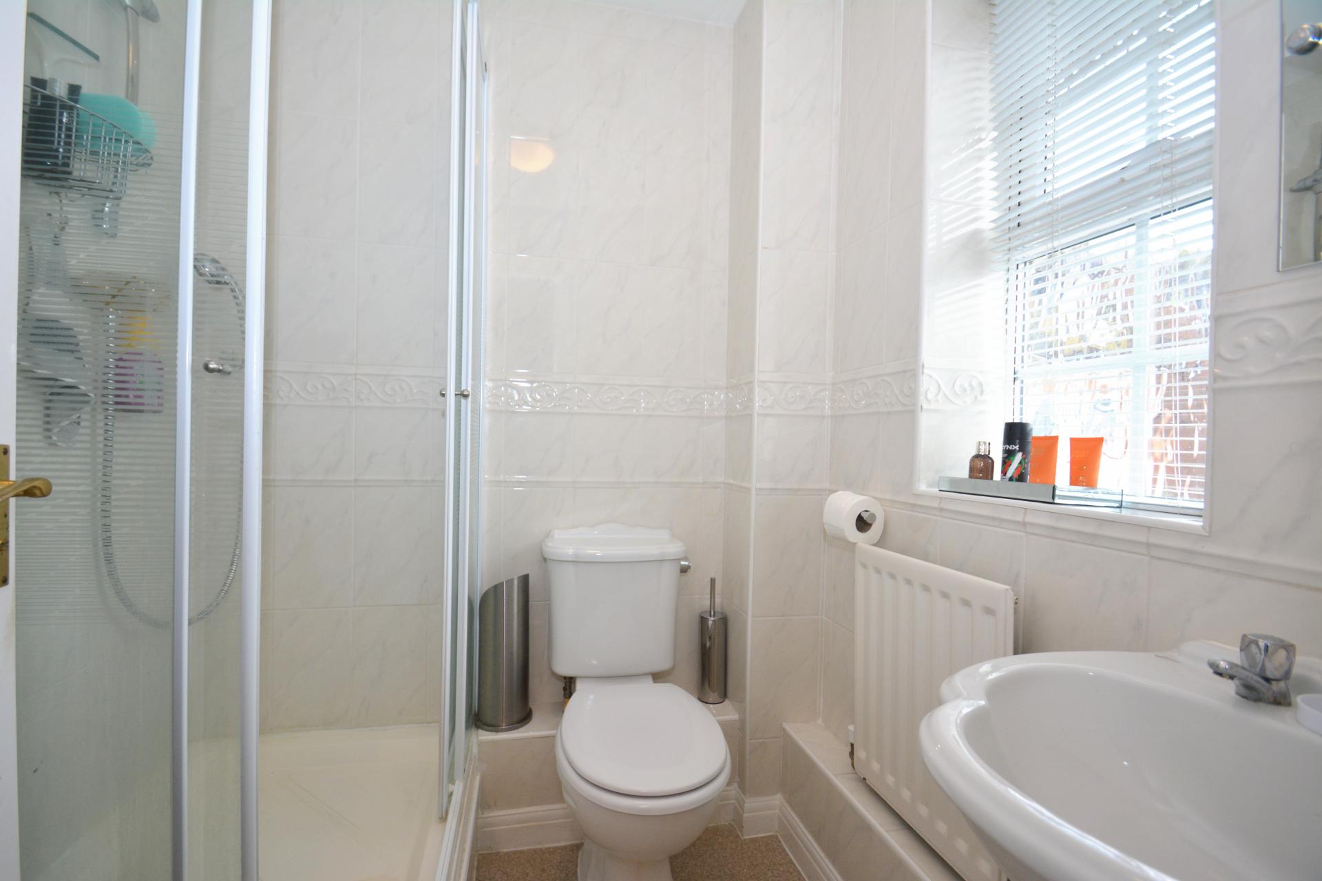 Tiled shower stall, low level WC, pedestal wash hand basin, radiator panel, double glazed window.