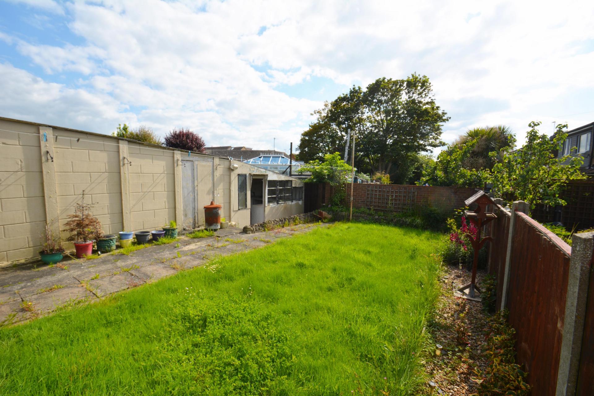 Garden to front with parking and detached garage. Rear garden with lawn, shrubs and workshop.