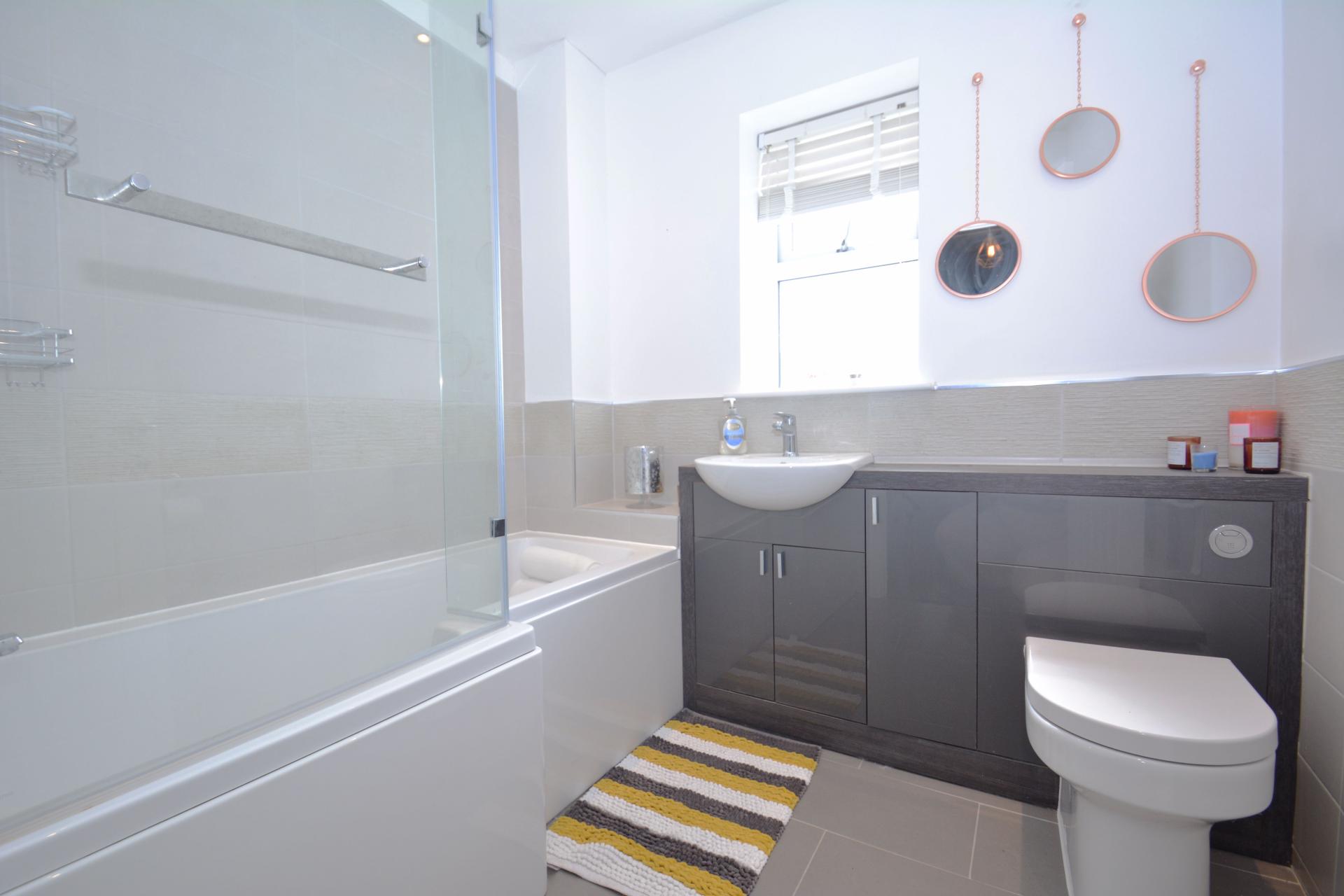 - Modern bathroom with shower over bath
