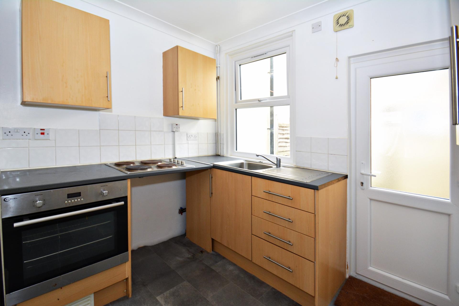 Fitted wall and floor cabinets, work surface space, sink unit, built in electric oven and separate hob, space for washing machine, vinyl floor, double glazed window and door to yard.