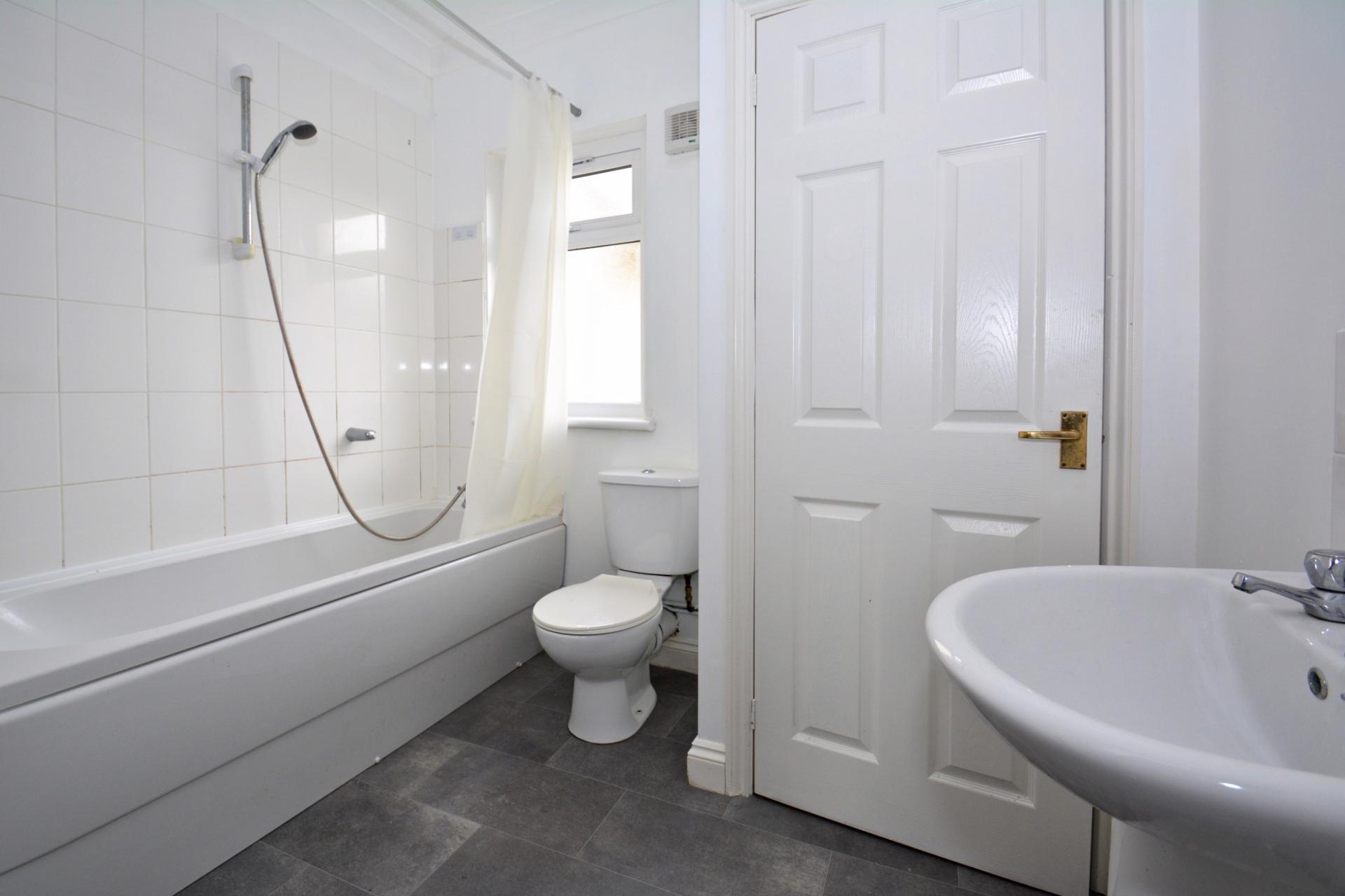 White suite comprising panel bath, pedestal wash hand basin, low level WC, radiator panel, gas boiler for hot water and central heating.