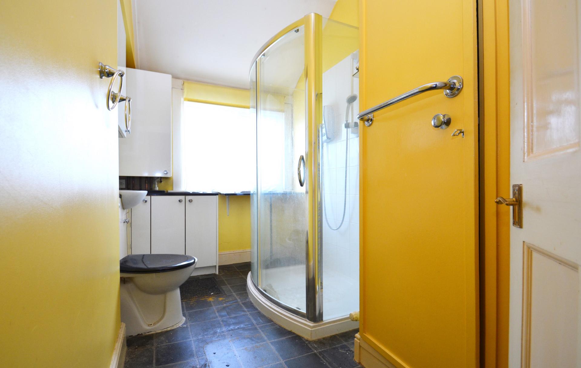 Vinyl floor, wash hand basin, shower stall, double glazed window, storage cupboard, low level WC.