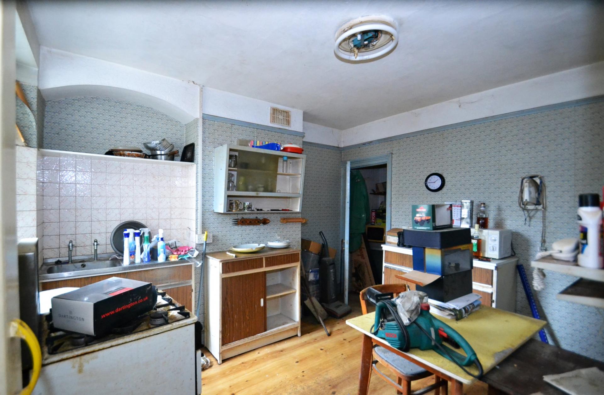 Vinyl flooring, sink unit, double glazed window, larder cupboard, picture rail, power points.