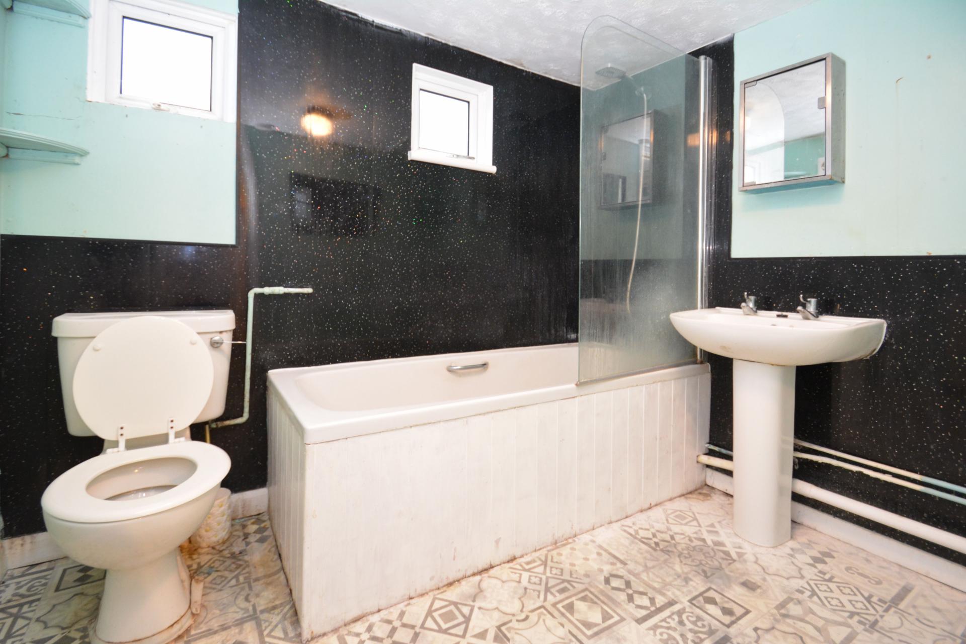 Panel bath, low level WC, pedestal wash hand basin, 2x double glazed window, radiator panel.