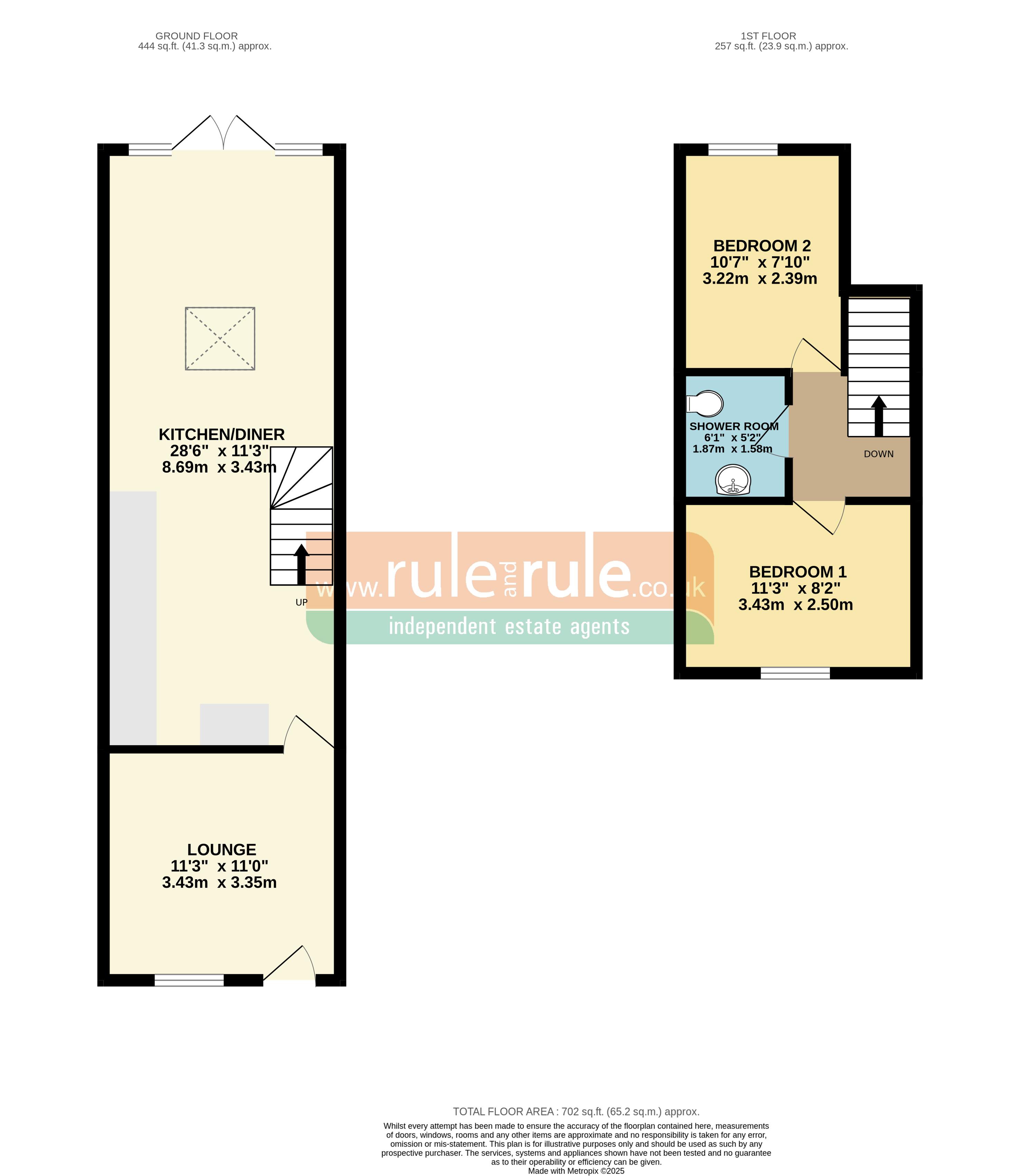 It features uPVC double glazing, gas-fired central heating, and a modern fitted kitchen with a built-in fridge/freezer on the ground floor. Upstairs, there are 2 bedrooms and a wet-room style shower room.