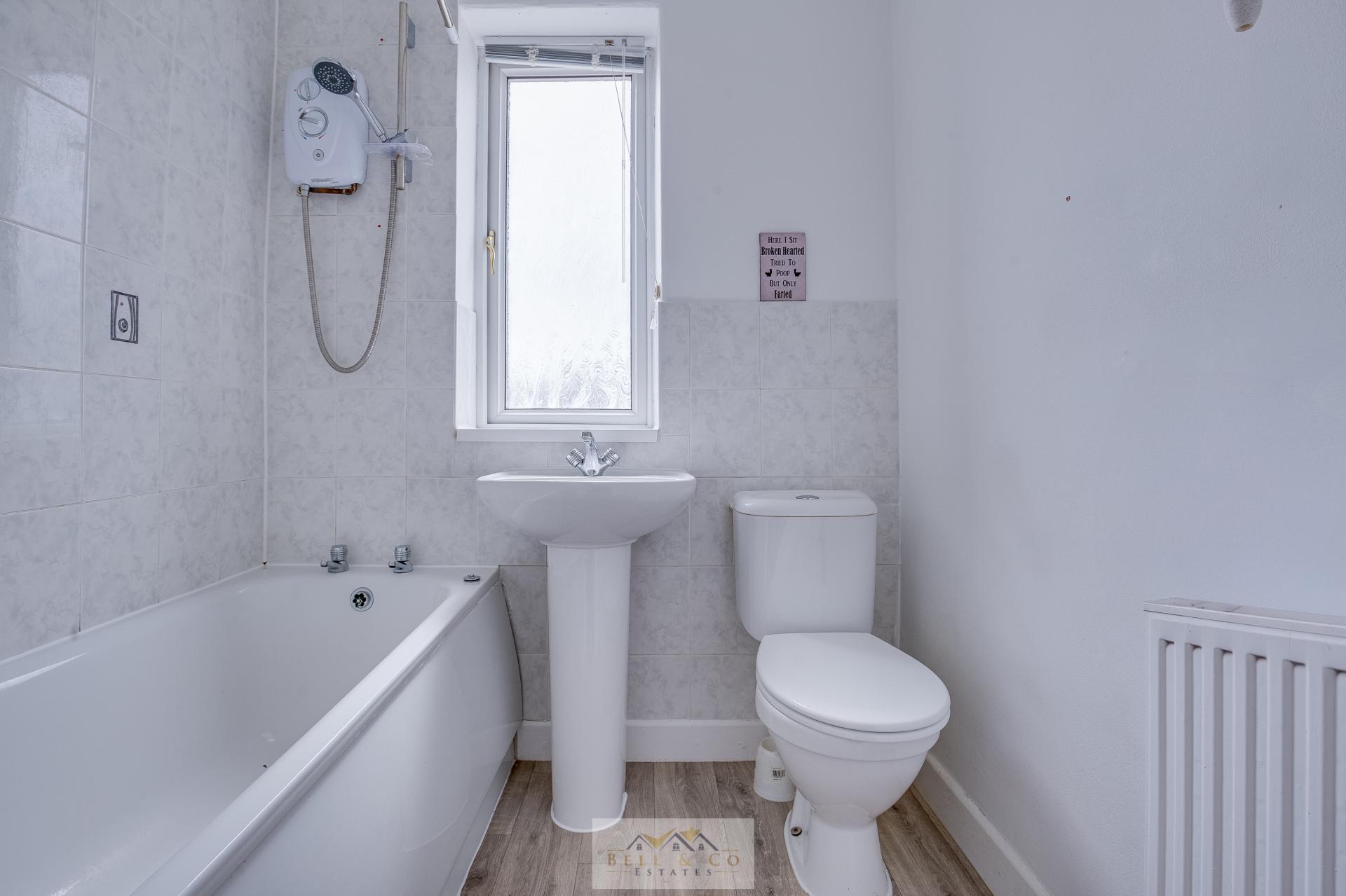 Family bathroom complete with shower over bath, wash basing and WC.