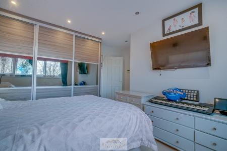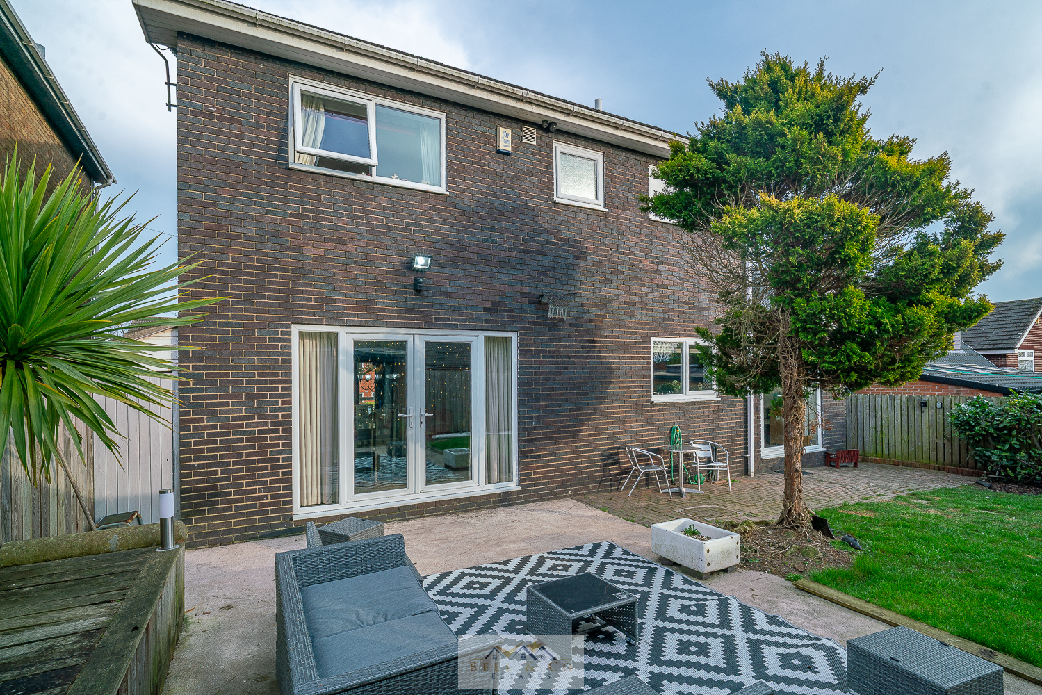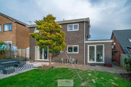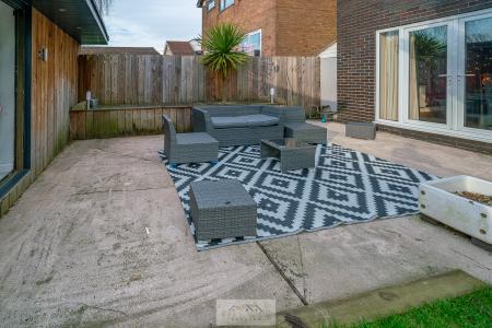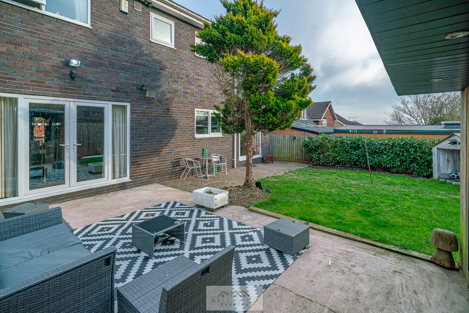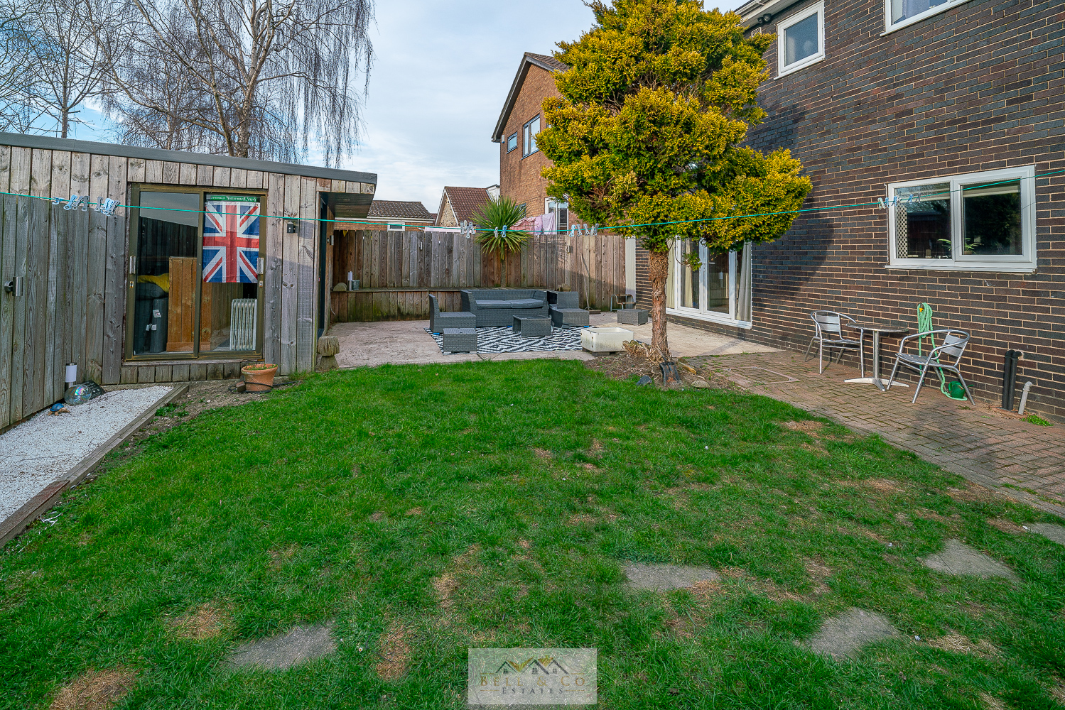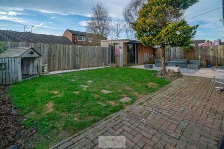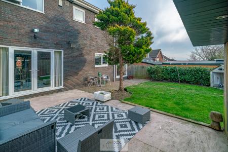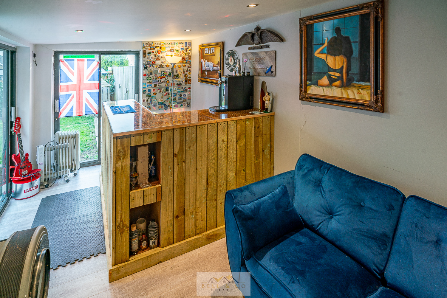 The large rear garden is ideal for both relaxation and entertaining, offering, A generous patio area, lawned section and outdoor bar with electric, creating the perfect entertainment space.