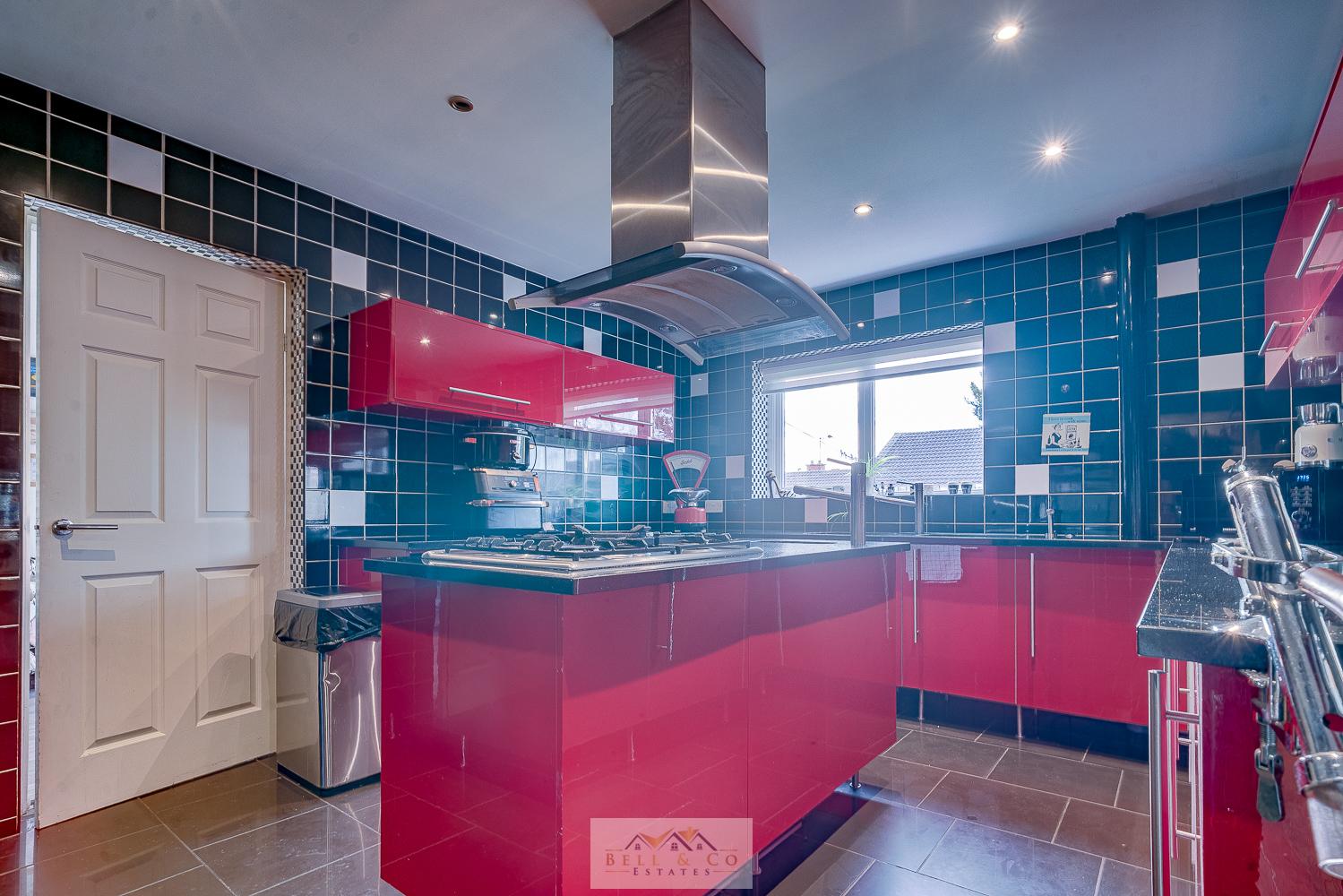 The modern open-plan kitchen is the heart of the home, complete with a central island, integrated appliances, and plenty of cupboard and worktop space, making it both stylish and functional.