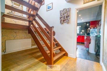 The entrance hallway sets the tone for the home with its striking open staircase, downstairs WC, and built-in storage cupboard.