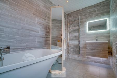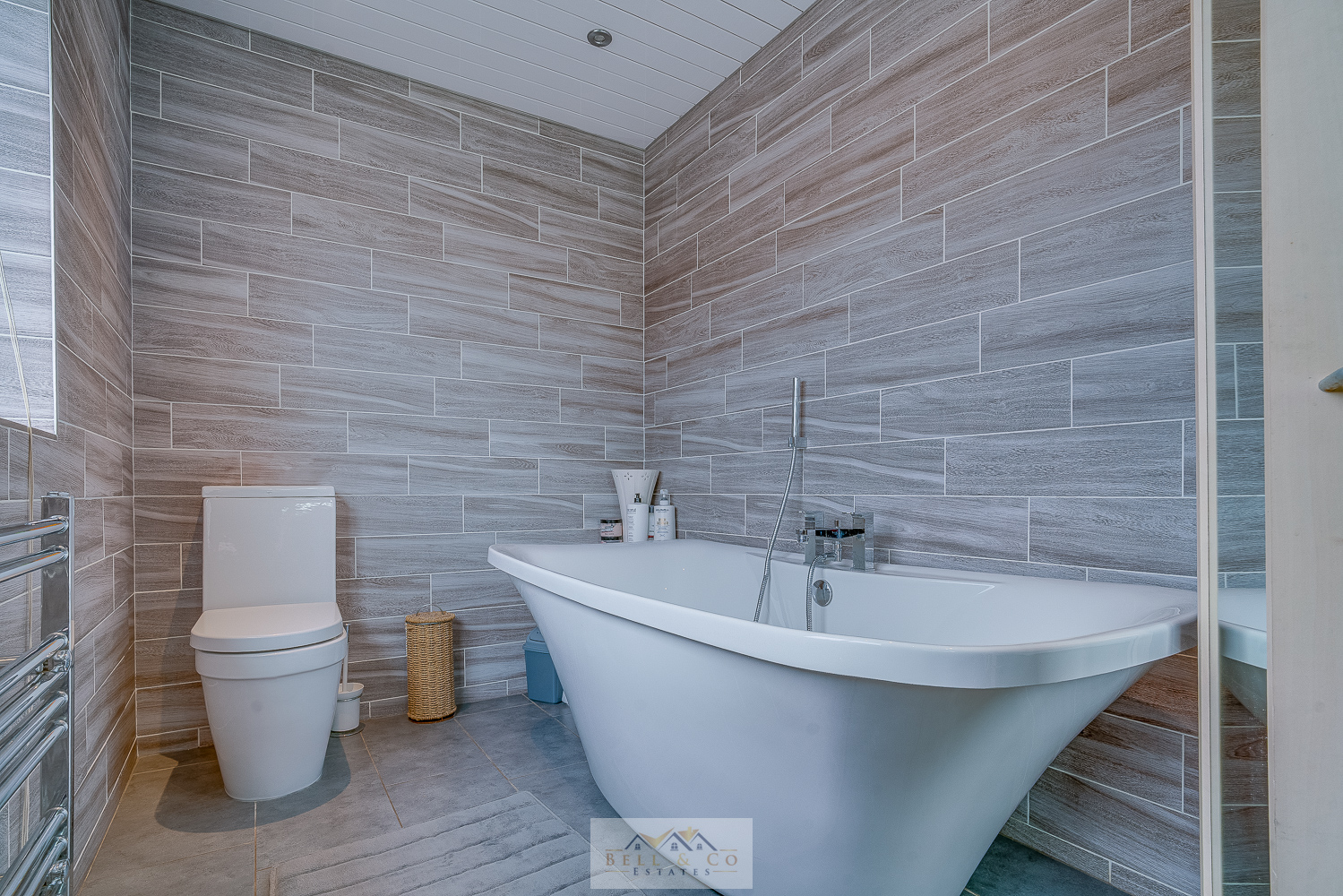 The contemporary family bathroom is finished to a high standard, featuring a freestanding bath, wash basin, and WC.