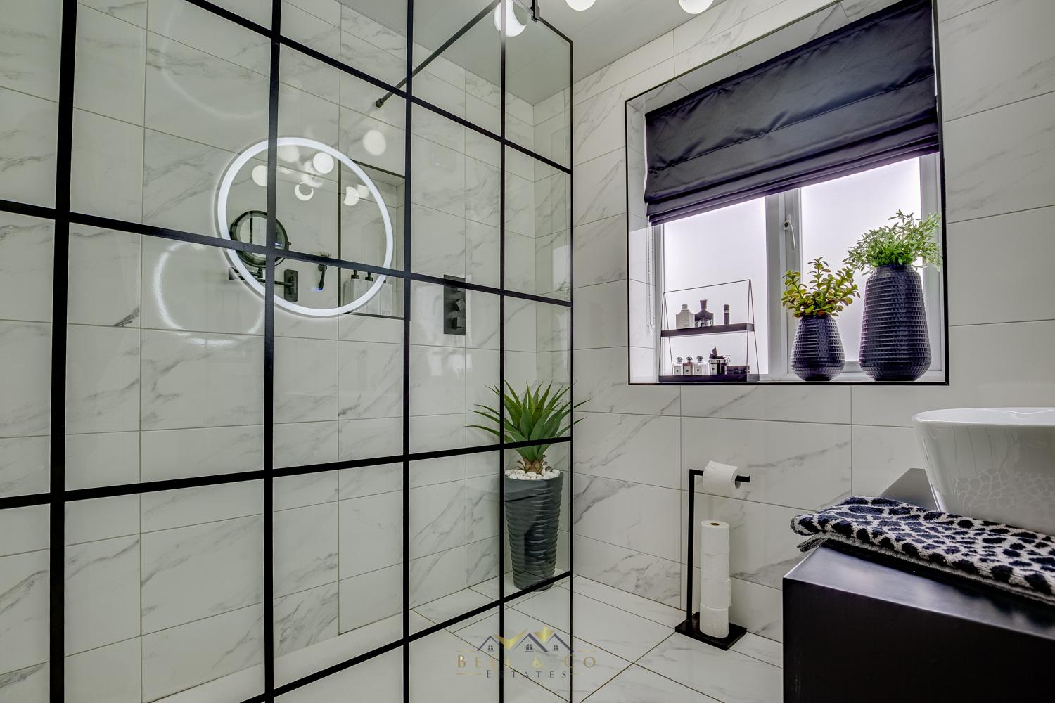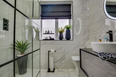 Upstairs, there are three generously sized bedrooms and a contemporary family shower room. The shower room is beautifully designed with marble-effect floor-to-ceiling tiles, a walk-in shower, WC, and a modern sink unit.