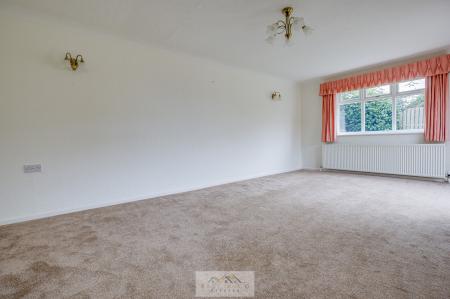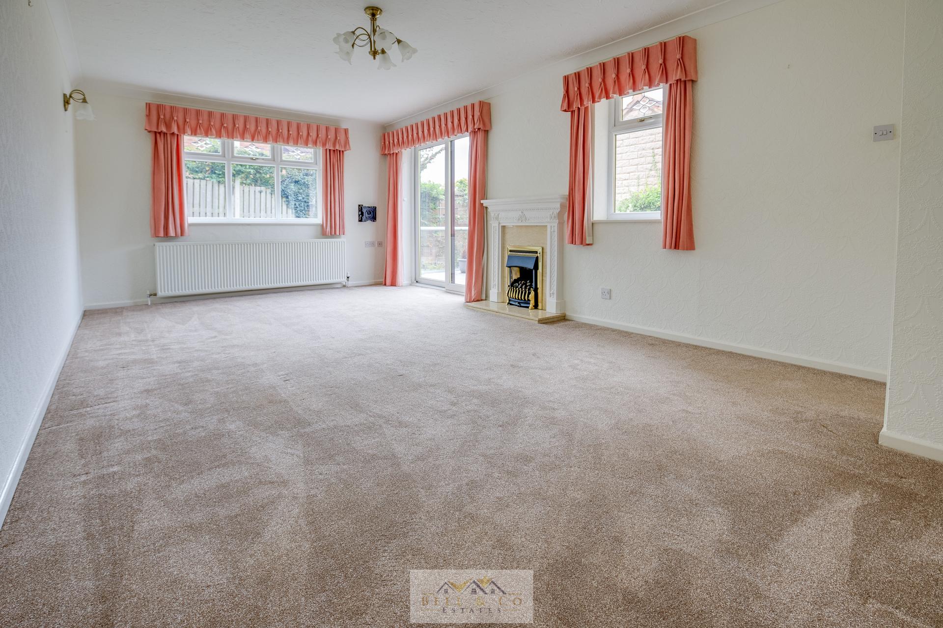 The large open-plan lounge and dining area is an inviting space, featuring a gas fire with surround. Sliding double doors open onto the veranda and rear garden, and additional dual-aspect picture windows allow natural light to flood the room.