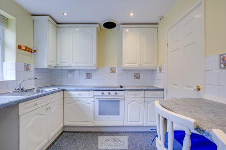 The fully functional fitted kitchen provides ample cupboard and worktop space, along with integrated appliances and a breakfast bar for casual dining. A rear door offers easy access to the back garden.