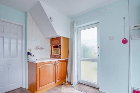 To the rear sits a well-proportioned kitchen with ample worktop and cupboard space, overlooking the garden with rear door access.