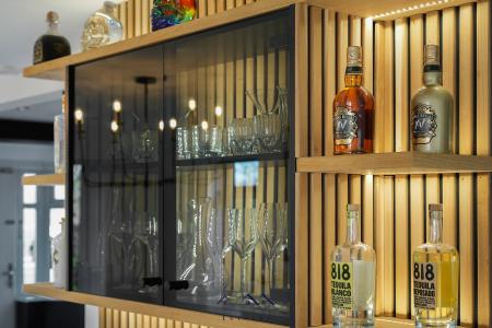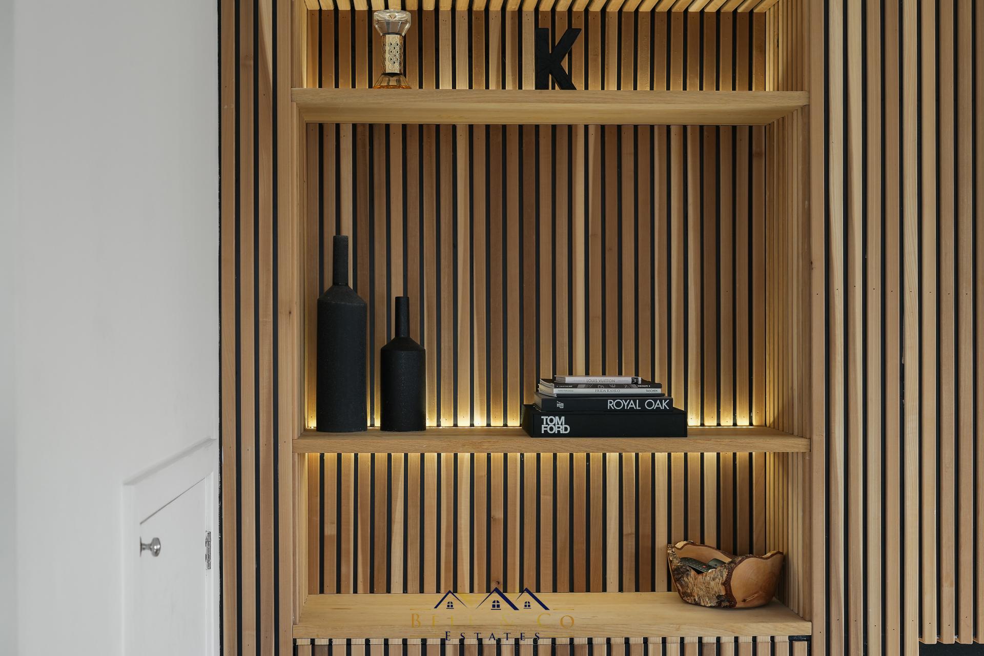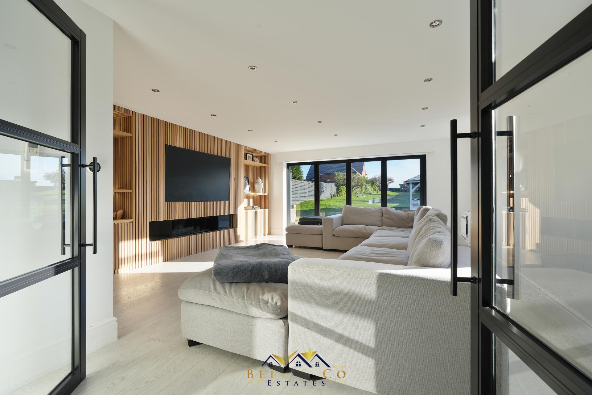 Continuing through into the formal Lounge with tulip wood panelled media wall with hidden storage cupboards and electric fire, underfloor heating, air conditioning unit, electronic blinds with bi-folding doors opening onto the rear patio area. The room and lighting are all controlled via the ALEXA mobile app.
