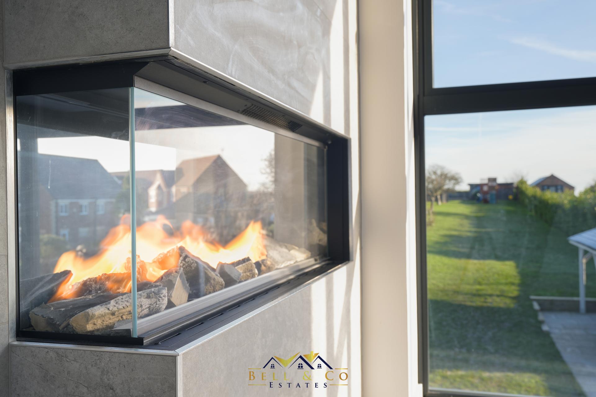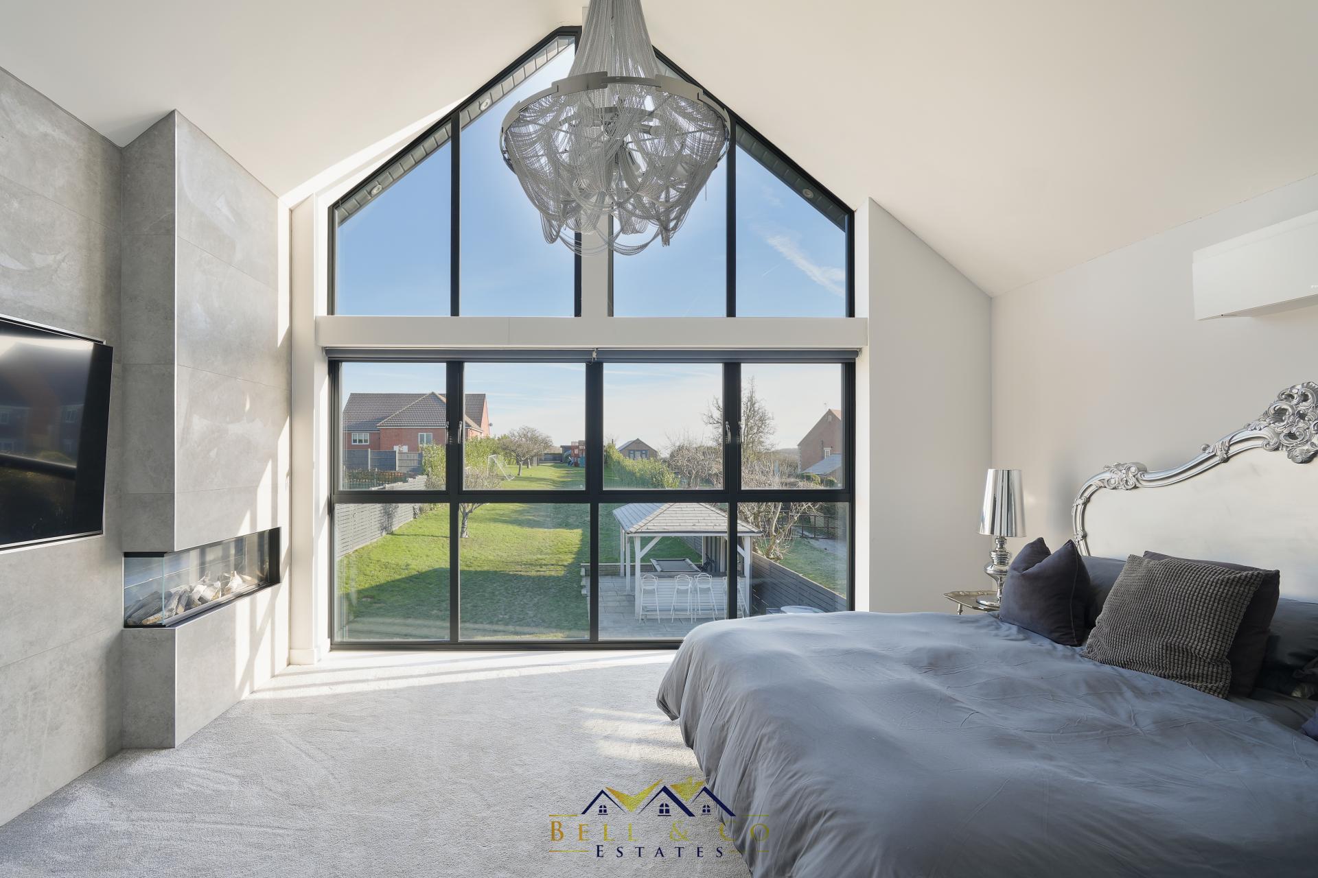MASTER SUITE 16' 1" x 13' 2" (4.9m x 4.01m) Master Suite with floor to ceiling windows which overlook the garden, to open countryside and beyond. Media wall with integrated electric fire, lights controlled via the ALEXA mobile app