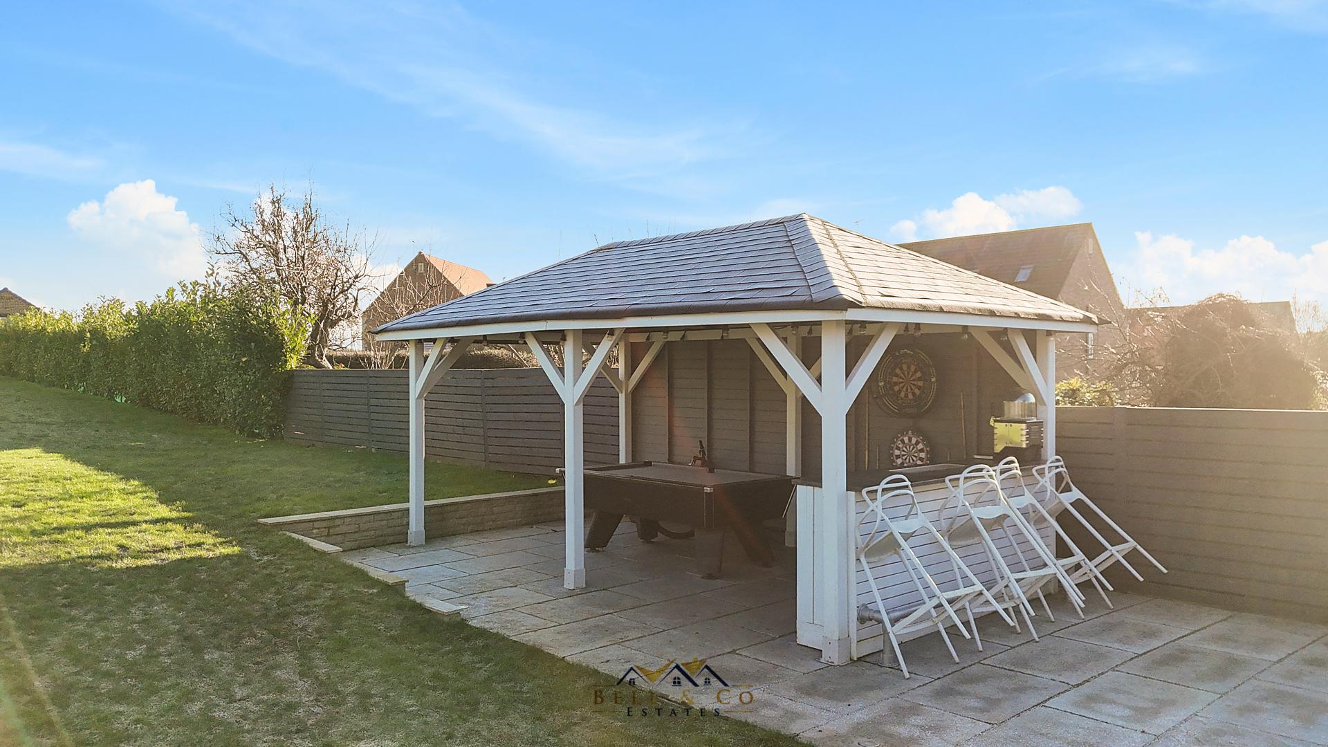 To the rear is a large patio area in Indian stone with built in seating area, Log Burner, Monolith Egg BBQ, two Pizza Ovens and Hot Tub.