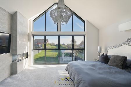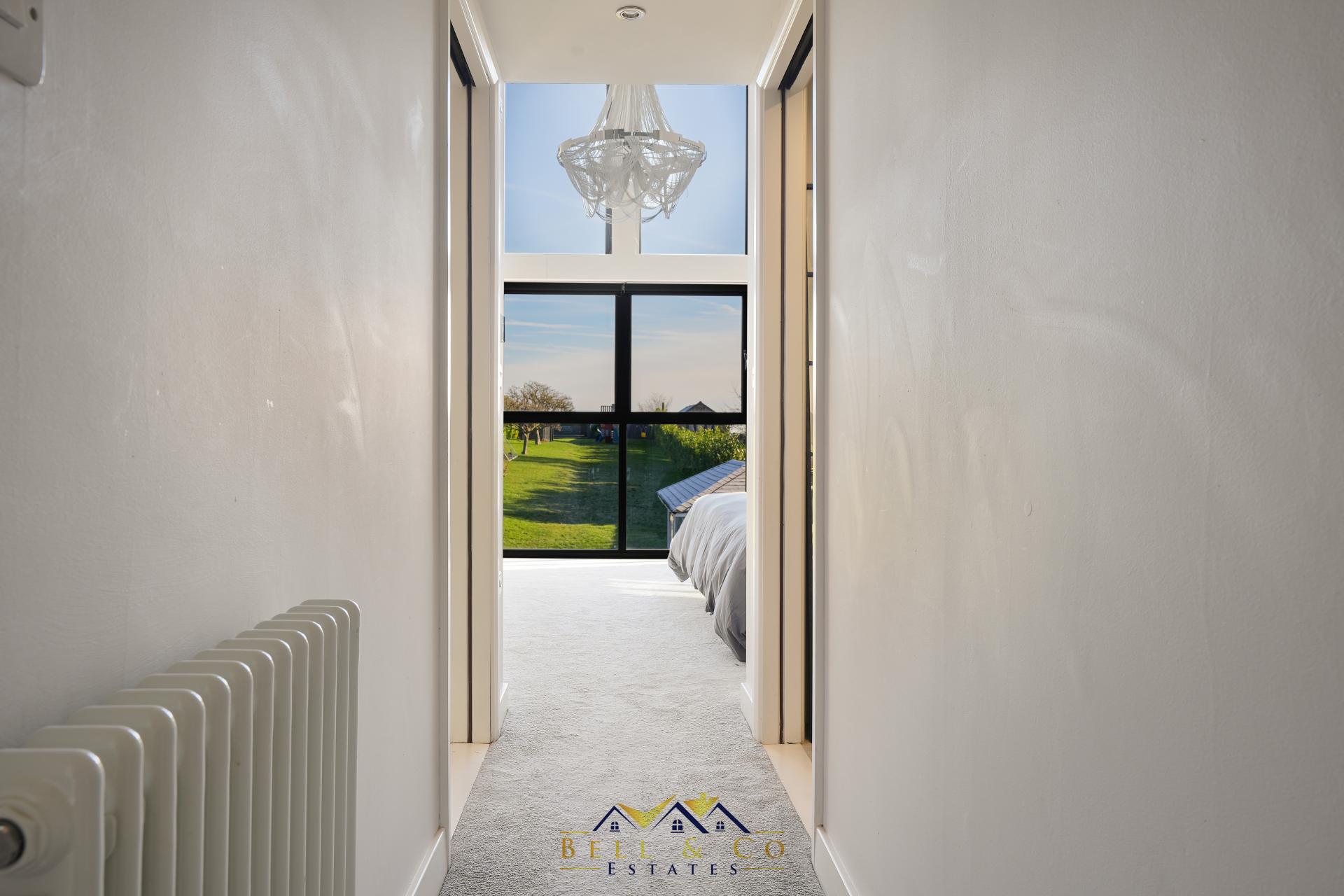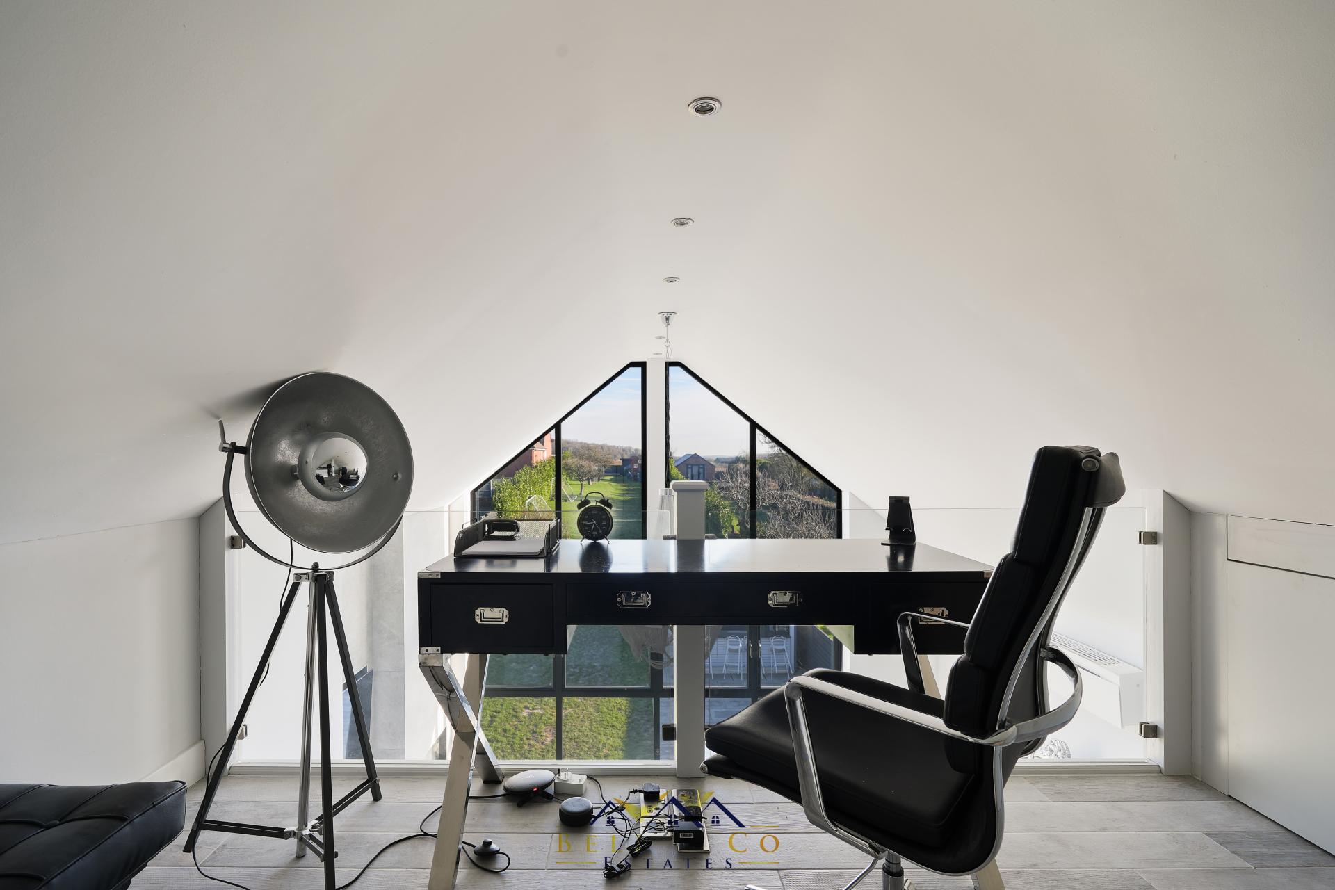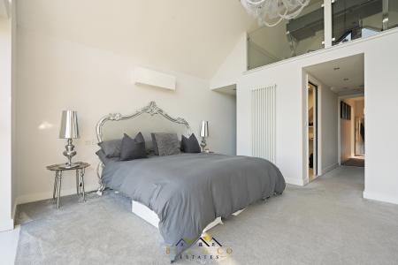 Along the galleried landing you will be memorised by the breath-taking views as you enter the Master Suite with floor to ceiling windows which overlook the garden, to open countryside and beyond. The Master Bedroom is just remarkable, Media wall with integrated electric fire, lights controlled via the ALEXA app, En-Suite Shower Room with vanity wash basin and WC, walk-in-wardrobe and mezzanine above which is currently being used as an office but does have plumbing for a freestanding bath!