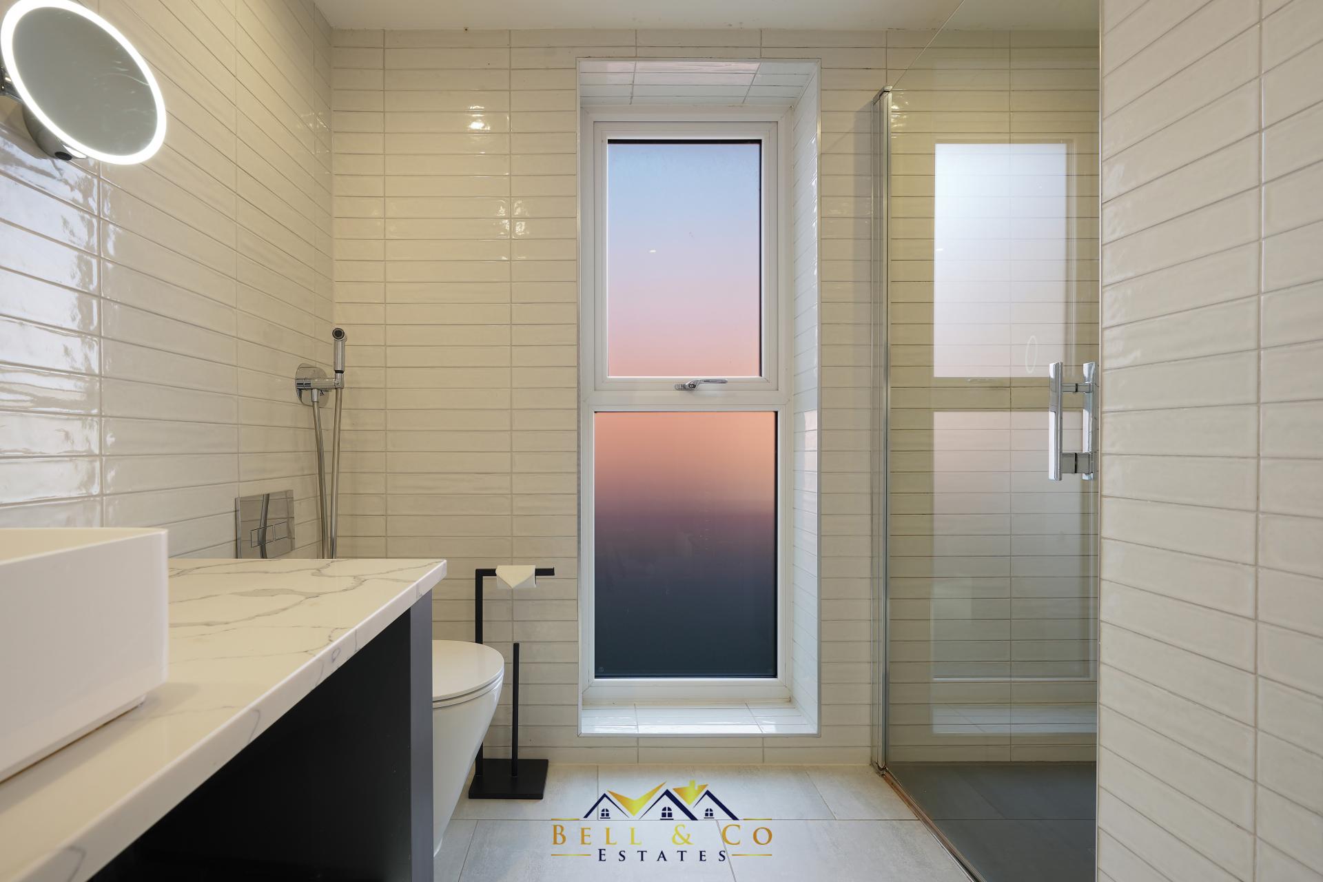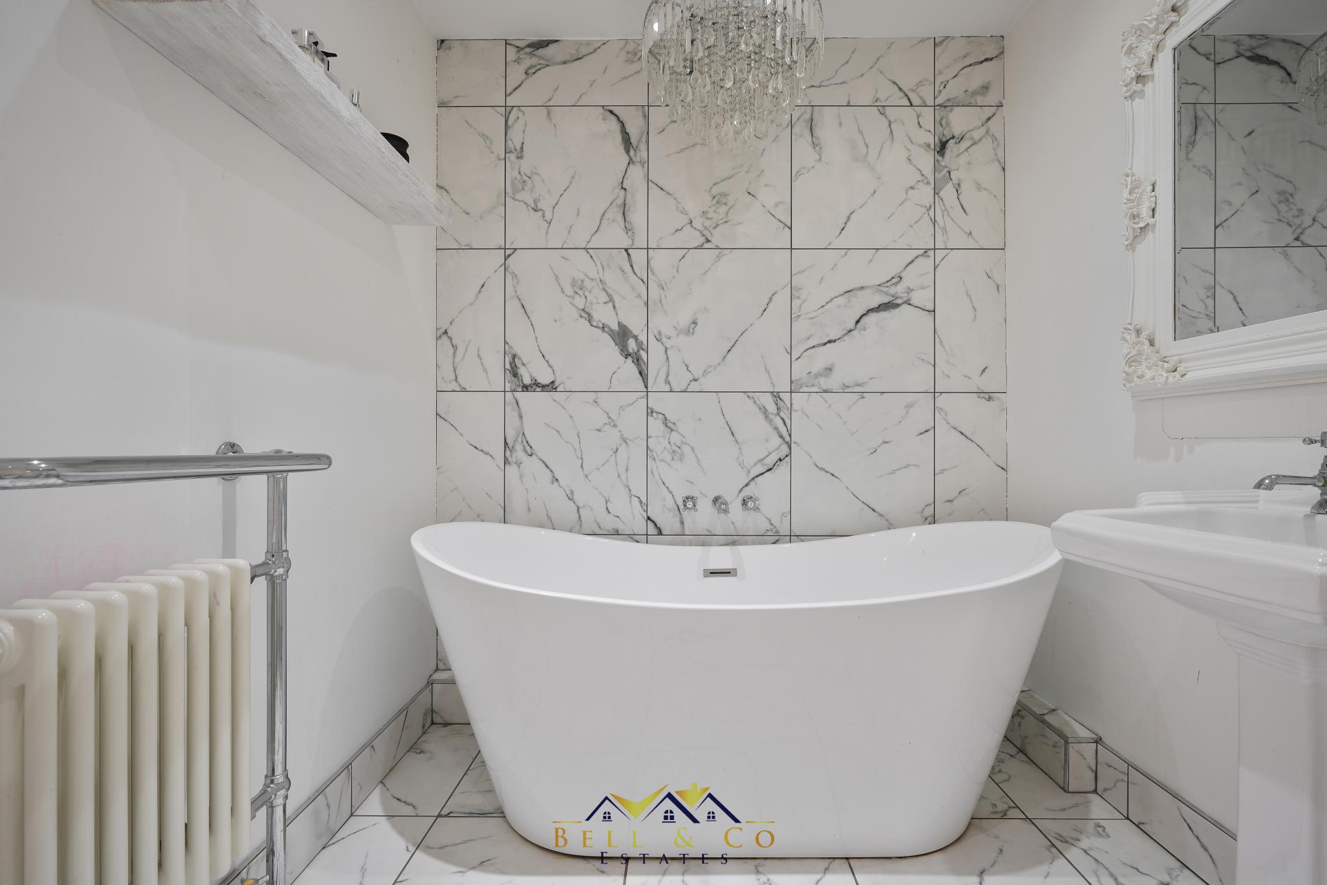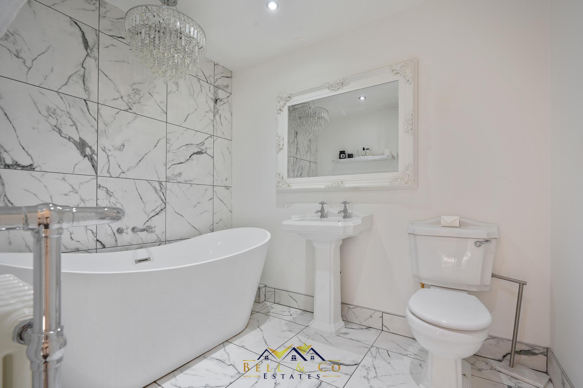A modern, freestanding bath invites you to take a soak at the end of a busy day. Marble floor to ceiling tiles with chandelier centre piece, wash basin and WC complete the suite.