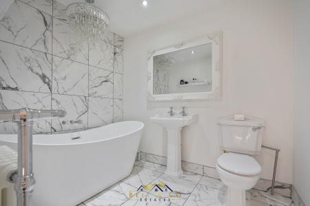 FAMILY BATHROOM 8' 3" x 6' 7" (2.51m x 2.01m) A modern, freestanding bath invites you to take a soak at the end of a busy day. Marble floor to ceiling tiles with chandelier centre piece, wash basin and WC complete the suite