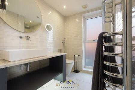 Clothes and accessories are neatly displayed in the large Dressing Room with its abundance of hanging and shelf space with a roomy En-Suite Shower room with double vanity wash basin, walk in shower and WC.
