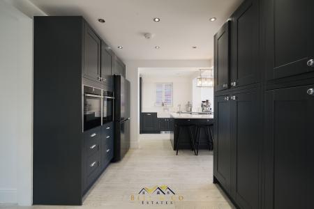 Flowing through to a large modern, fitted Kitchen with island and integrated appliances including; Neff Double Oven, Fridge, Freezer, two Dishwashers, rubbish disposal and instant hot water tap, Dining Area with log burner, wooden beams and bi-folding doors opening onto the patio area. This kitchen truly has it all and is certainly the hub of the house.