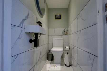 The dining space also provides access to the convenient downstairs wc with wash basin, as well as a separate utility room, adding practicality to the sleek design.