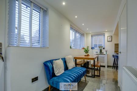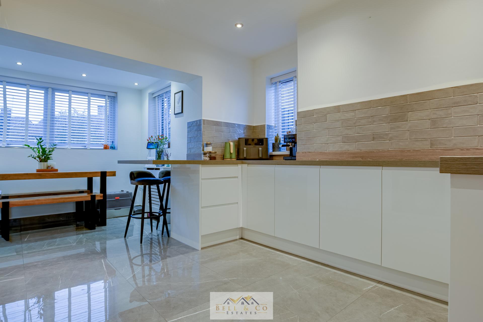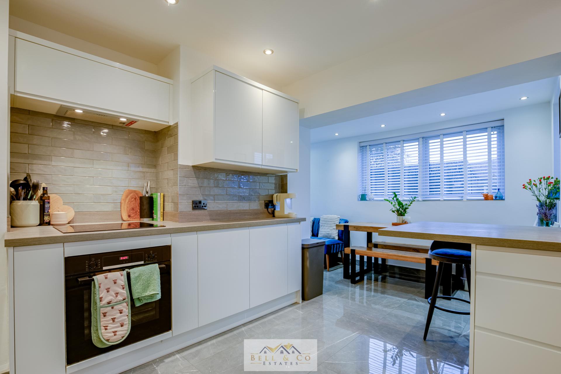 To the rear of the property sits the beautifully modern fitted kitchen, offering an abundance of worktop and cupboard space along with integrated appliances. This stylish kitchen opens seamlessly into the dining area, creating a fantastic open-plan layout.