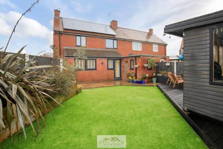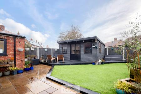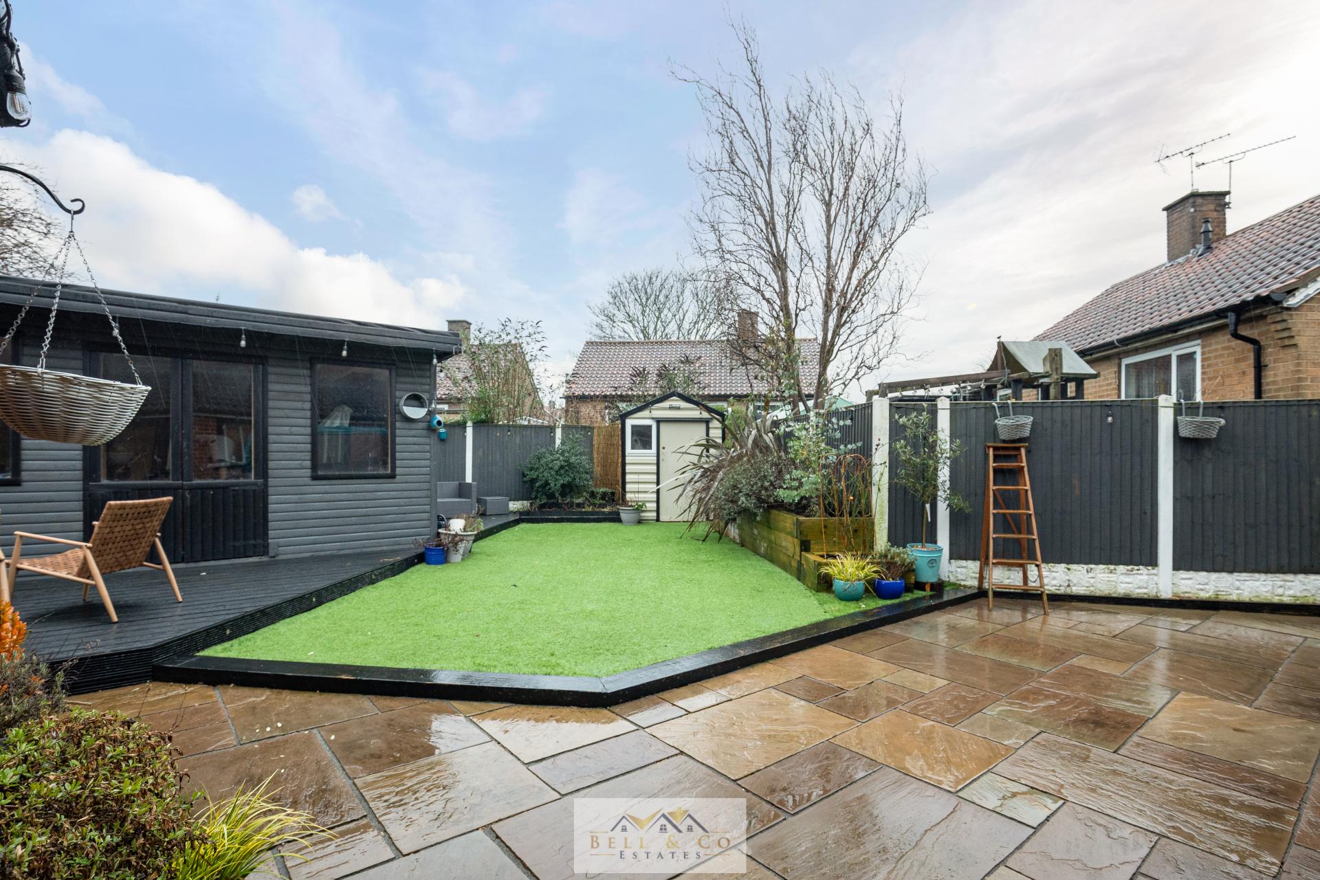 The garden includes an Indian stone patio area, artificial grass, attractive borders, and a versatile summer house or man cave-perfect for hobbies, relaxation or entertaining.