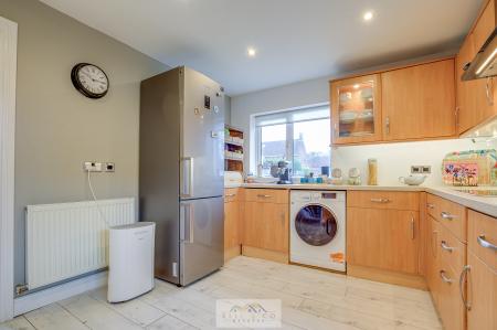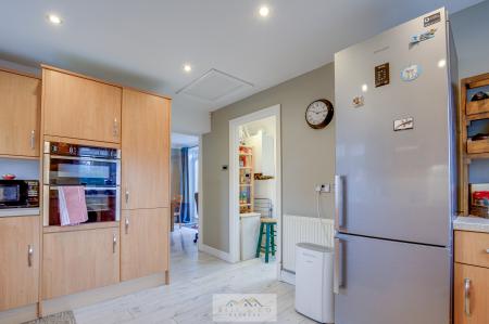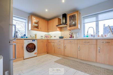 The modern fitted kitchen provides ample worktop and cupboard space with integrated appliances and access to the separate utility room and WC for added convenience.