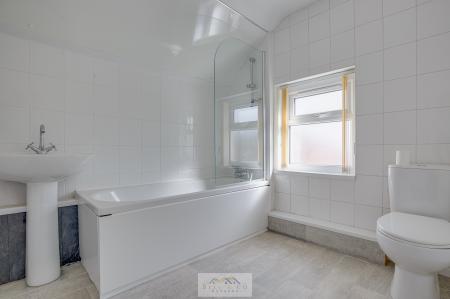 A modern fitted bathroom completes the first floor, comprising bath with shower over, wash basin, and WC. To the front is a fenced lawned garden with further grassed area and parking nearby.