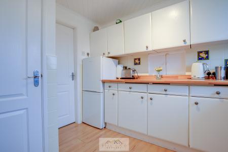 To the rear sits a separate, well-appointed kitchen, ample worktop and storage space, and a rear access door leading out to the garden.